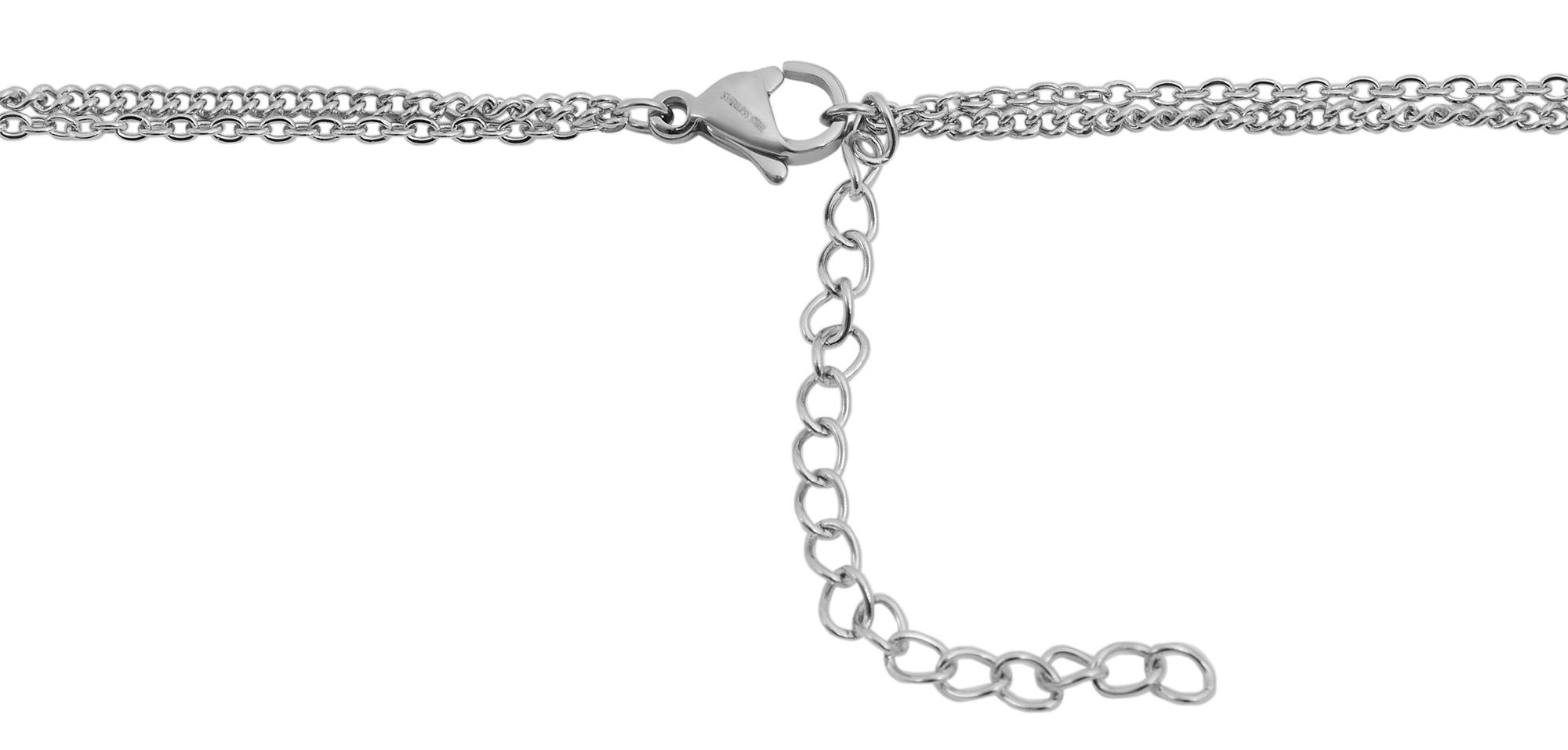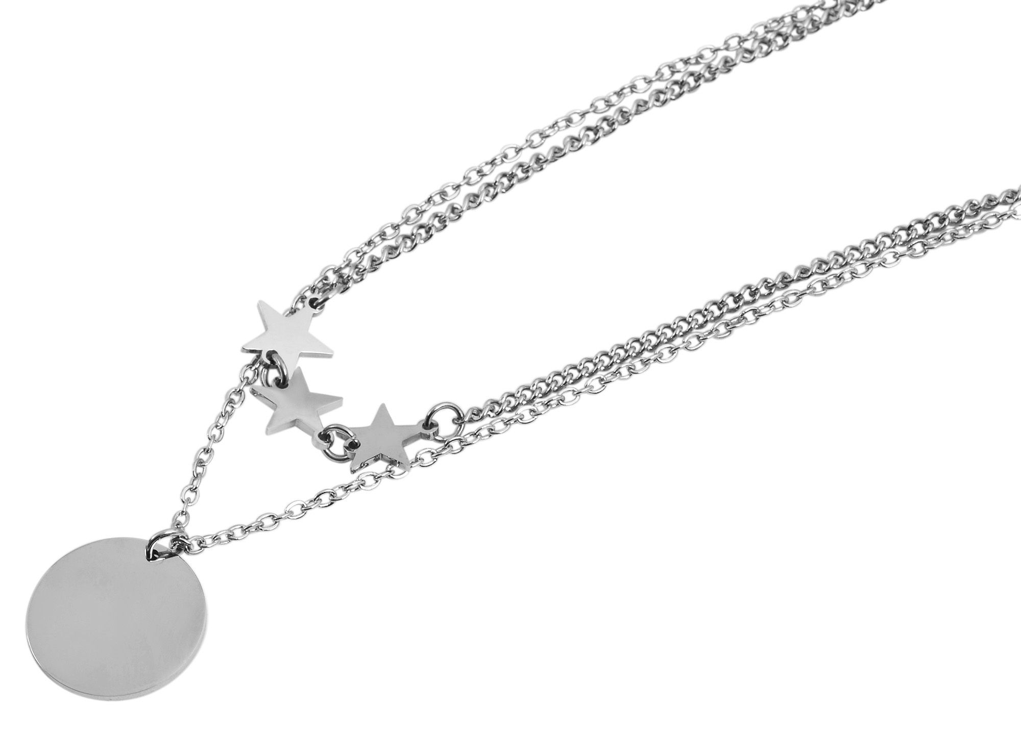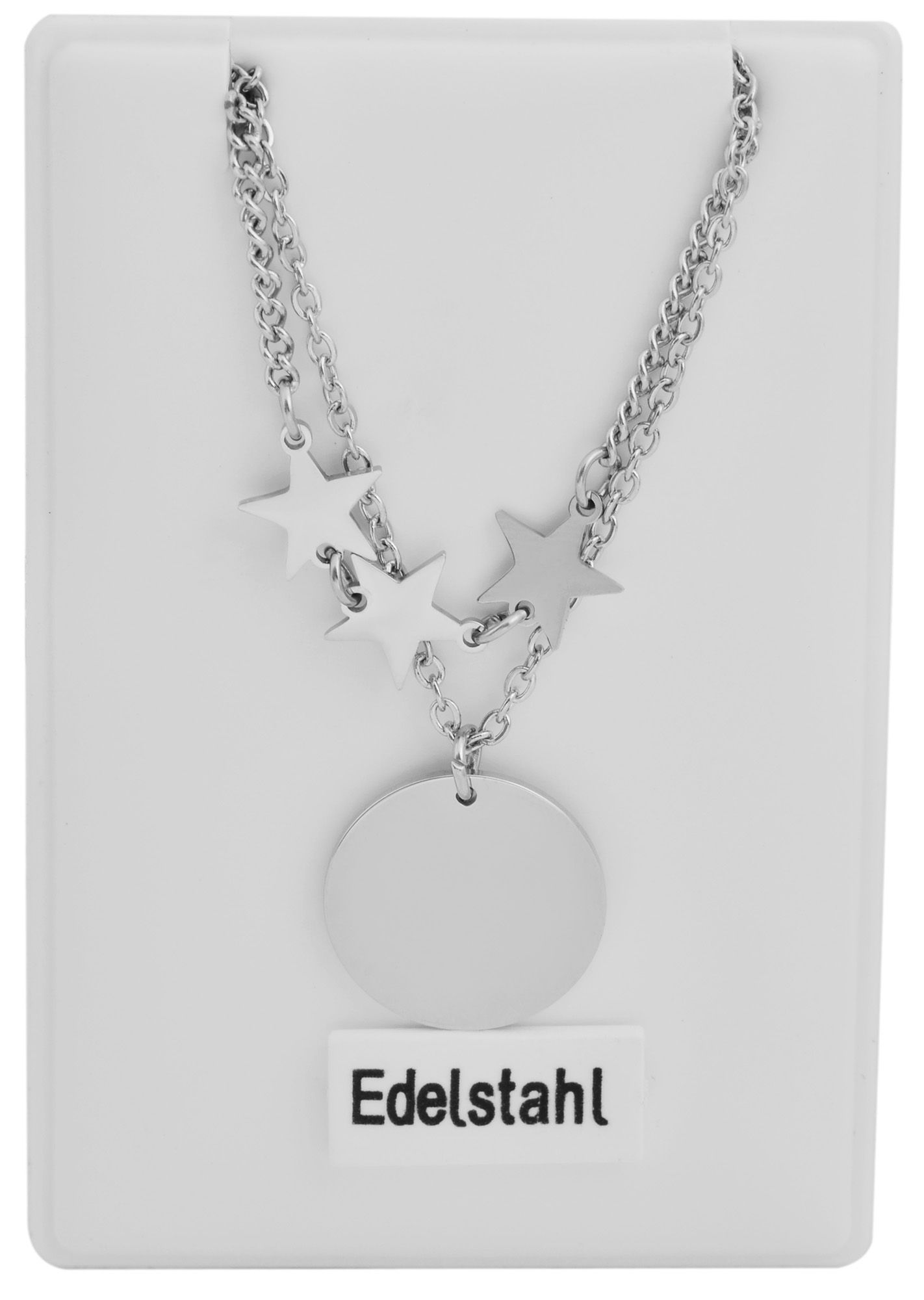 De ketting van het merk Akzent is gemaakt van roestvrij staal. Het bestaat uit twee ankerkettingen in een trendy layering look. Samen hebben de kettingen een lengte van 45 cm, de kortste van de twee heeft een lengte van 40 cm. Aan één uiteinde van de ketting is ook een verlengketting van 5 cm bevestigd, waarmee de lengte met 5 cm kan worden gevarieerd. De 40 cm lange ketting wordt onderbroken door een rij sterren. Aan de langere ketting is een munt bevestigd met een diameter van 15 mm. Dit zorgt voor een fascinerende look en is ideaal voor allerlei gravures. De mogelijkheid om de ketting aan te passen maakt het een geweldig en persoonlijk cadeau-idee. Het materiaal is zeer robuust, duurzaam en ook geschikt voor mensen met een allergie, omdat roestvrij staal bijzonder vriendelijk is voor de huid. Het geweldige ontwerp van deze ketting benadrukt perfect elke look en zal elke leeftijdsgroep aanspreken.
