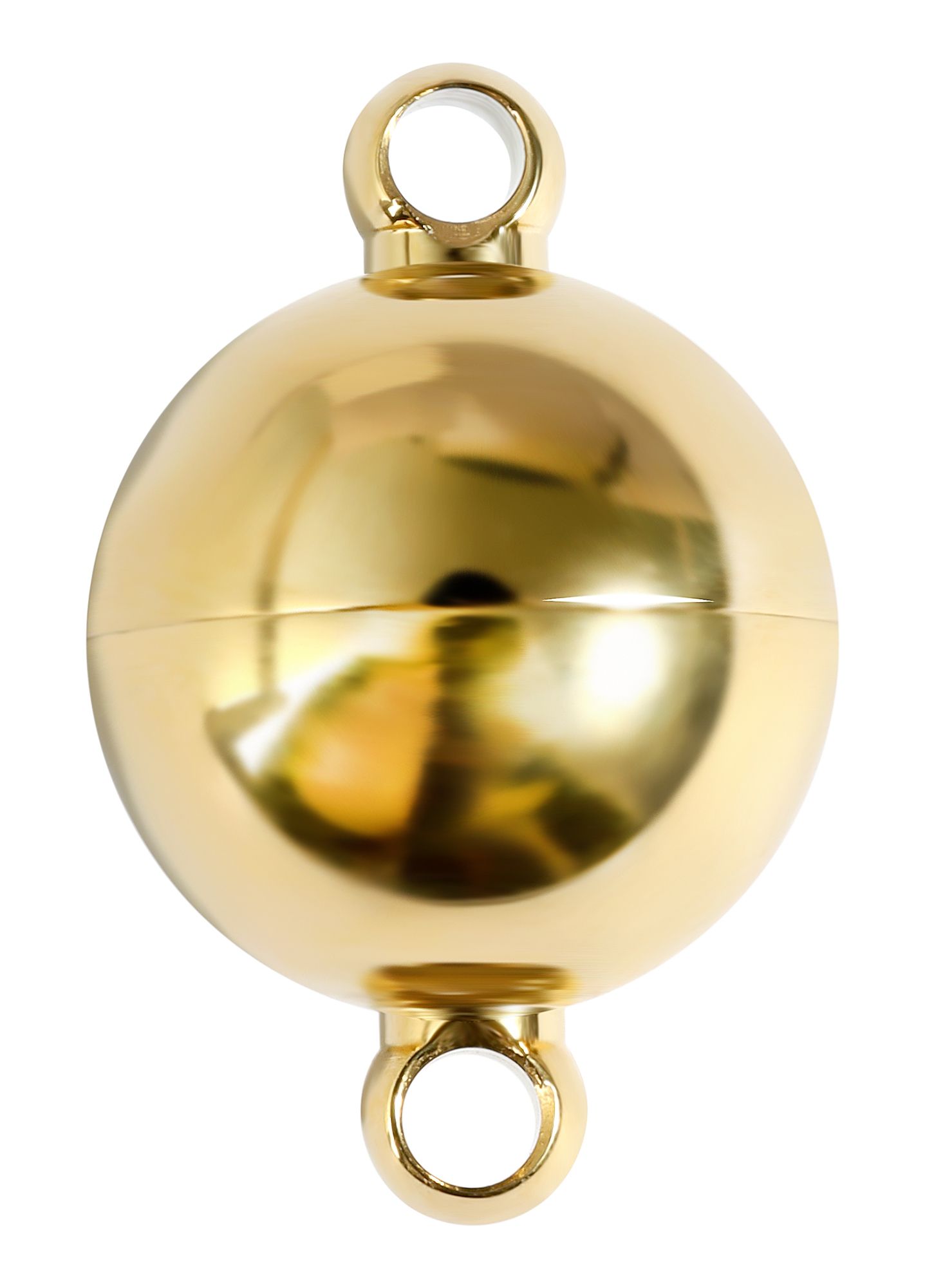 Die Magnetschließe der Marke Akzent ist aus rostfreiem Edelstahl gefertigt und in verschiedenen Größen erhältlich. Die Oberfläche ist goldfarbig und hochglanzpoliert. Die Kugelförmige Schließe enthält links und rechts jeweils eine offene Öse, an der beliebige Ketten befestigt werden können. Diese Art von Schließen ist sehr praktisch und einfach zu handhaben, da sich die magnetischen Enden durch einfaches aneinanderhalten zusammen finden. Der Durchmesser beträgt 10 mm.