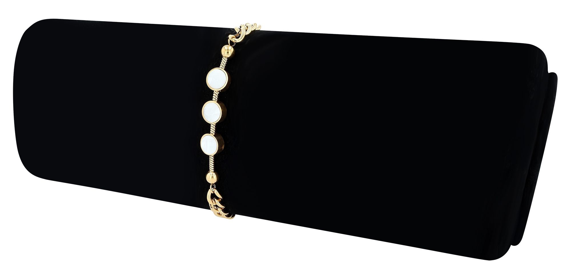 De gepantserde armband, gemaakt van hoogwaardig roestvrij staal, is niet alleen duurzaam maar maakt ook een modestatement. Het geïoniseerde, goudkleurige oppervlak geeft de armband niet alleen een bijzondere kleurdiepte, maar maakt hem ook bestand tegen slijtage en krassen. Het materiaal is niet alleen robuust en corrosiebestendig, maar ook hypoallergeen - een ideale keuze voor alle huidtypes. Met een lengte van 16,5 cm plus een verlenging van 3,5 cm biedt de roestvrijstalen armband niet alleen een perfecte pasvorm, maar ook de flexibiliteit om hem aan te passen aan persoonlijke voorkeuren. De breedte van 6 mm en de dikte van 2,5 mm geven de armband een evenwichtige aanwezigheid op de pols zonder opdringerig te zijn. Het middelpunt wordt gevormd door drie 8 mm ronde parelmoer elementen, die in perfecte symmetrie in het midden van de curb chain armband zijn geplaatst en de algehele look harmonieus afronden.