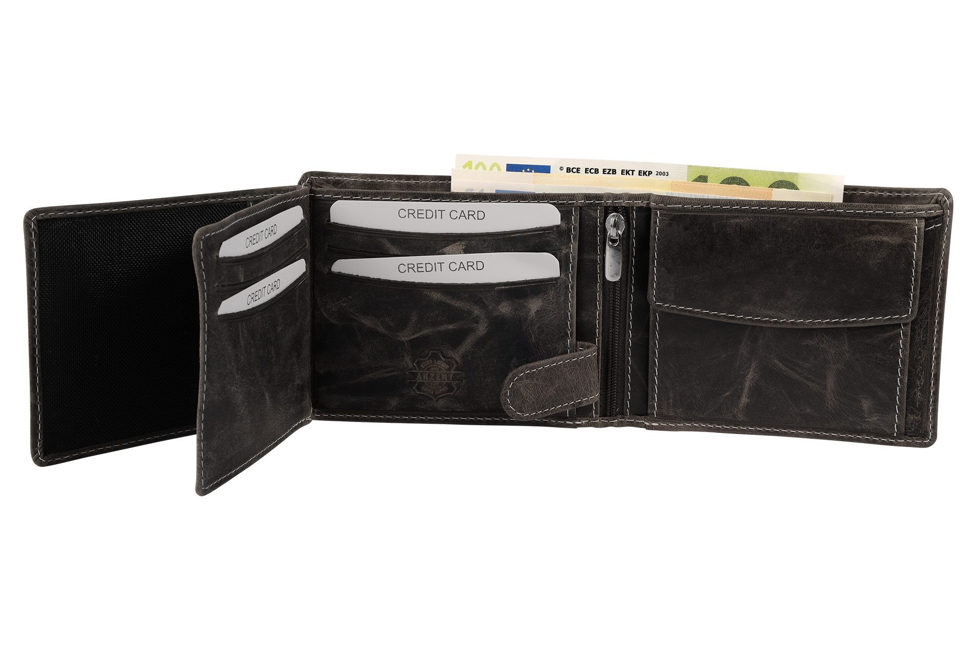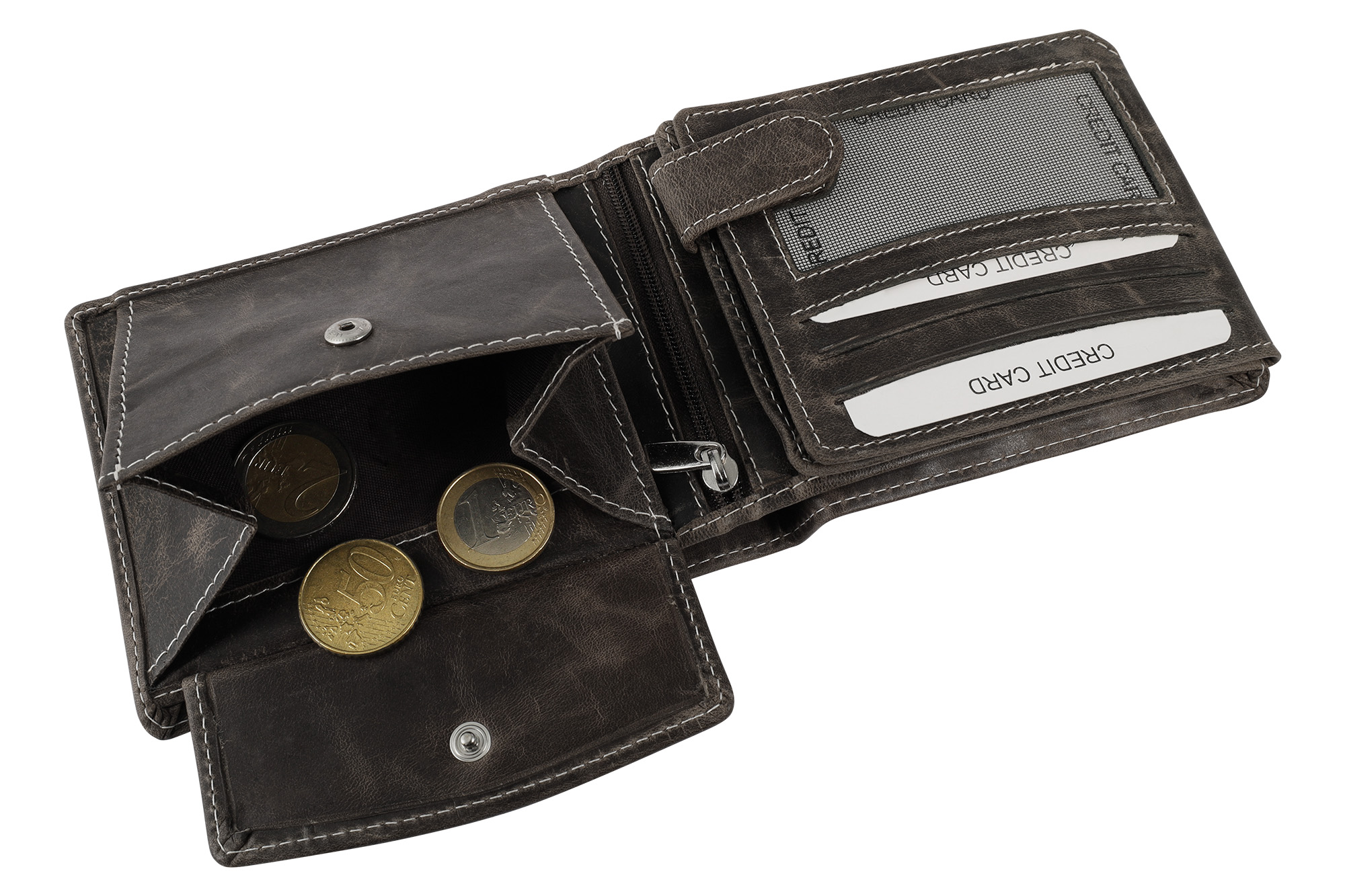 De portemonnee in liggend formaat heeft een aantrekkelijke crunch look en houdt je pasjes veilig binnenin met een extra drukknoopsluiting. De portemonnee is voorzien van 9 vakken voor je creditcards, een klein kleingeldvak, 2 vakken voor ID-kaarten, 2 insteekvakken, 2 open vakken voor bankbiljetten en een vak voor bankbiljetten dat is beveiligd met een rits, ideaal voor op reis. Deze portemonnee van hoge kwaliteit is gemaakt van synthetisch leer, dat in tegenstelling tot echt leer minder onderhoud nodig heeft, vlekbestendig is en bepaalde ecologische voordelen heeft ten opzichte van echt leer. De afmetingen van deze aantrekkelijke alledaagse metgezel zijn L 9,5 cm × B 12 cm, met een diepte van 2 cm als hij leeg is. Zeker een praktische en moderne portemonnee voor hem en haar, altijd en overal.