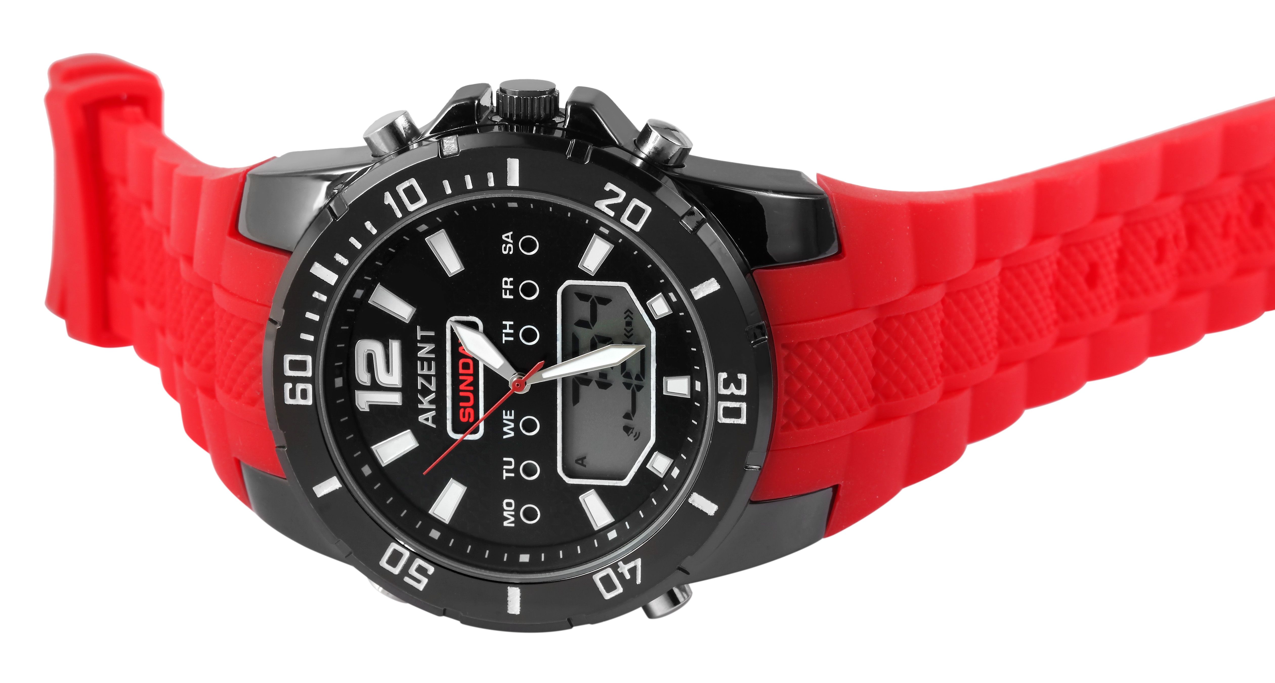 Productinformatie "Akzent analoog digitaal herenhorloge met siliconen band, rood"