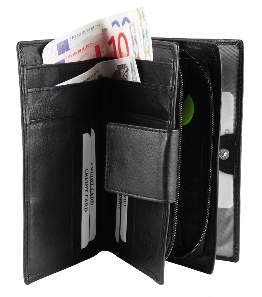Accent damesportemonnee van echt leer. De liggende portemonnee is 16 cm breed en 10 cm hoog. De kleur is zwart. De portemonnee van echt leer wordt gesloten met een drukknoopsluiting. Hij heeft 2 biljetvakken, een klein kleingeldvak, 10 creditcardvakjes en 2 transparante ID-kaartvakken.