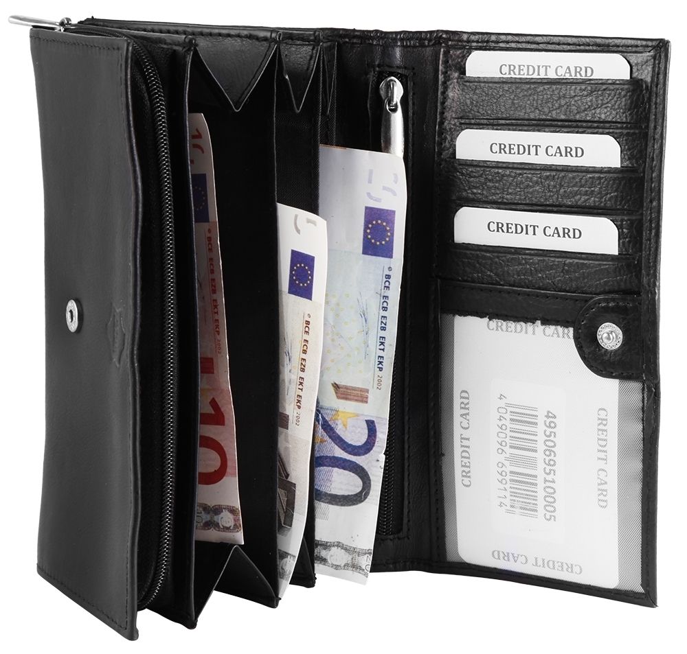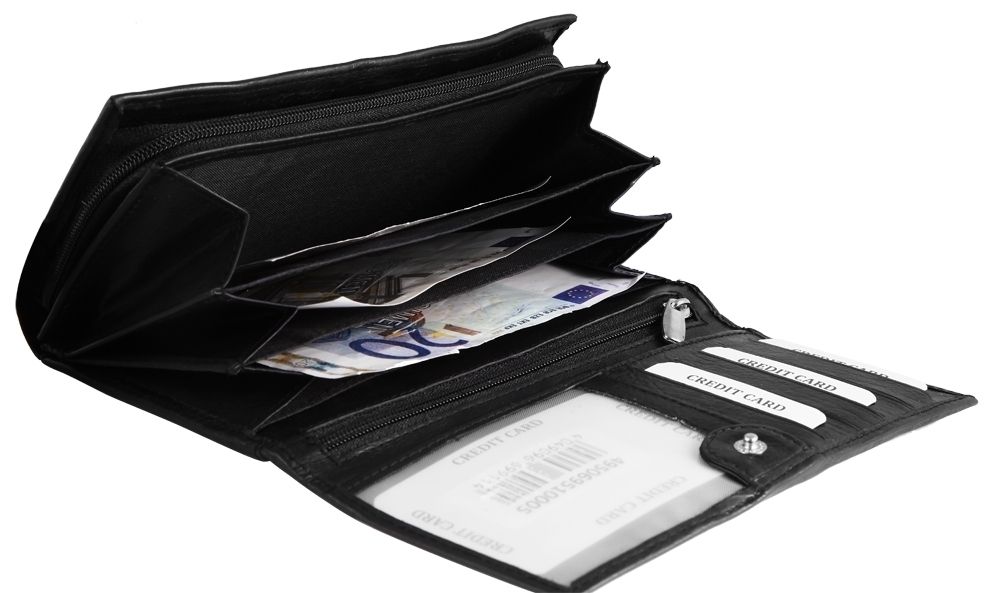 Accent damesportemonnee van echt leer. De liggende portemonnee is 17 cm breed en 10 cm hoog. De kleur is zwart. De portemonnee van echt leer wordt gesloten met een drukknoopsluiting. Hij heeft 4 biljetvakken, een klein kleingeldvakje, 5 creditcardvakjes, een transparant creditcardvakje