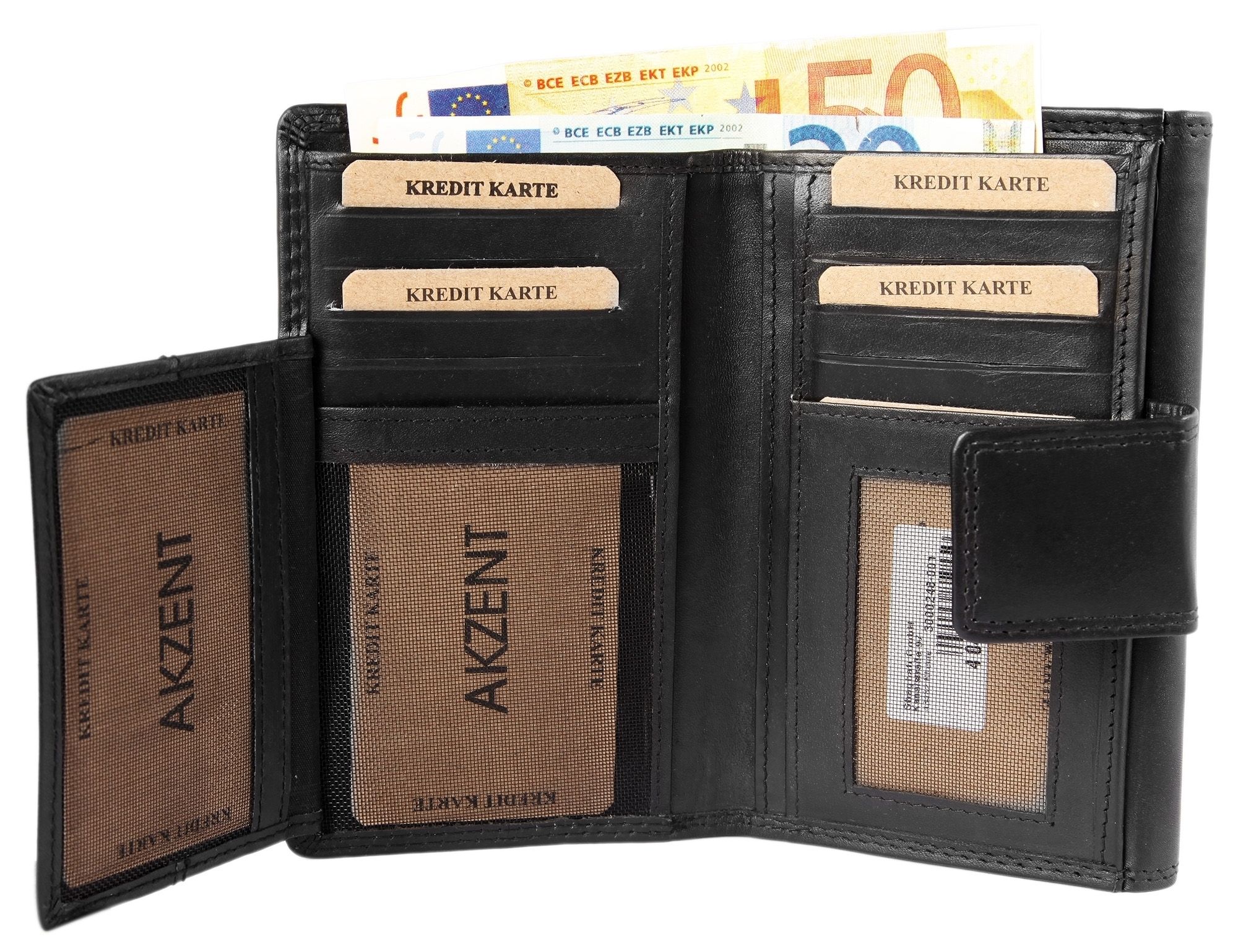 De zwarte damesportemonnee van het merk Akzent is gemaakt van echt leer in liggend formaat. De dubbele stiksels aan de buitenkant en de enkele stiksels aan de binnenkant van de portemonnee zorgen voor een goede duurzaamheid en stabiliteit. De portemonnee is niet alleen een visuele blikvanger, maar ook een echt ruimtewonder en biedt veel opbergruimte voor alle belangrijke documenten. De portemonnee is verdeeld in 14 creditcardvakjes, 1 biljetvak, 3 insteekvakken, 1 muntvak en 1 ritsvak aan de binnenkant. De portemonnee wordt gesloten met een praktische drukknoopsluiting. De ongevulde maat is 9,5 cm lang, 15,5 cm breed en 2,5 cm dik.
