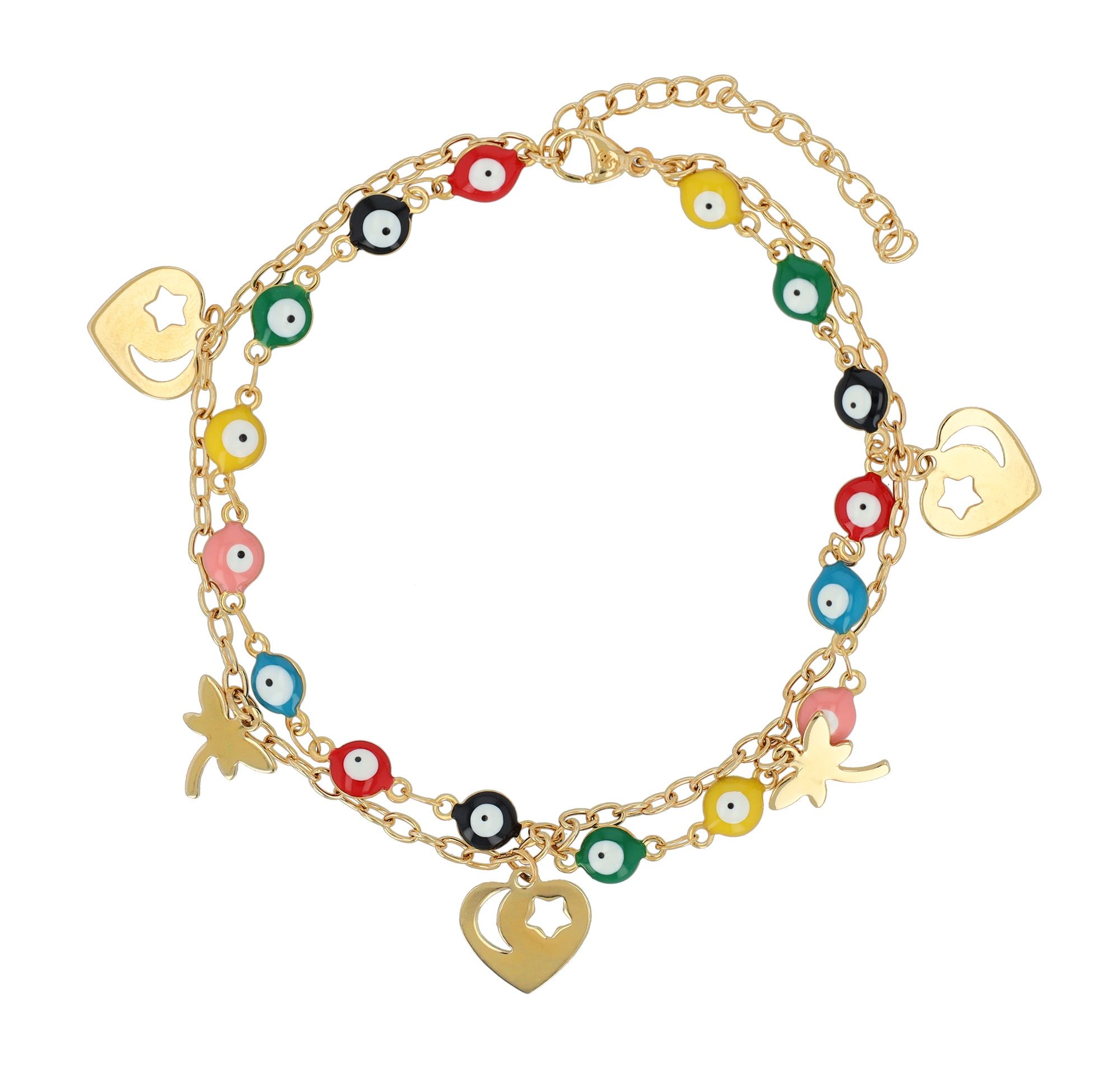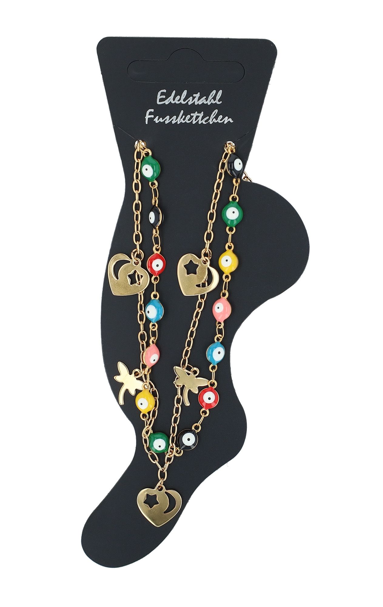 De twee kettingen zorgen voor een harmonieus geheel en zijn voorzien van speelse ontwerpen - de ene is versierd met twee hangers in de vorm van palmbomen en drie hartvormige symbolen, de andere met kleurrijke kralen die het "Nazar-oog" voorstellen. De praktische karabijnsluiting maakt het aan- en uitdoen gemakkelijk en zorgt voor een goede pasvorm.
