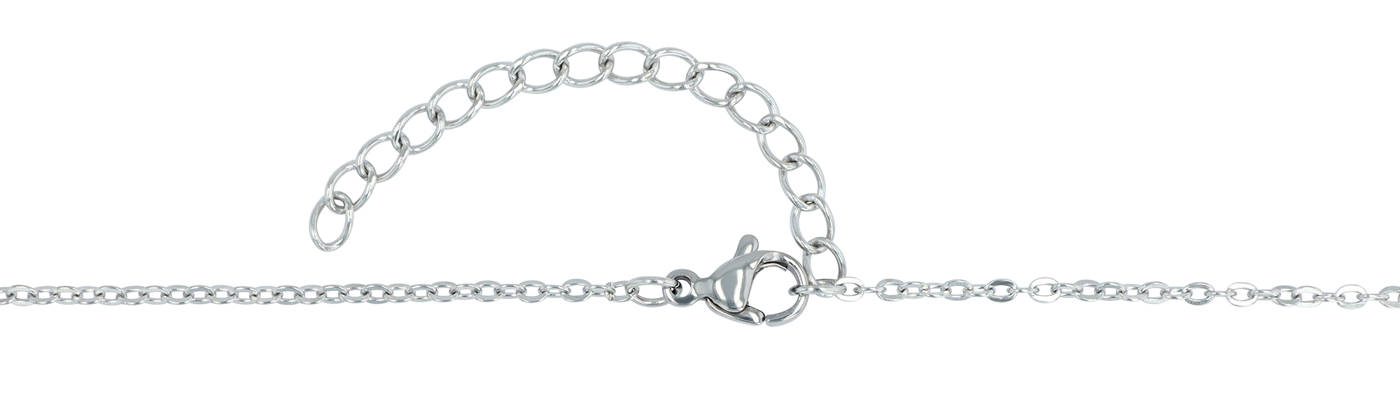Het materiaal is bijzonder stevig, duurzaam en huidvriendelijk. De ketting heeft een ankerpatroon en is 45 cm lang. Hij wordt gesloten met een klassieke karabijnsluiting, die voorkomt dat hij vanzelf opengaat. Aan één uiteinde van de ketting is een verlengketting van 5 cm bevestigd, waarmee de lengte kan worden gevarieerd. De ankerketting is ook versierd met een ovale hanger met een kunstparel. Deze heeft een lengte van 36 mm, een breedte van 16 mm en een dikte van 10 mm.