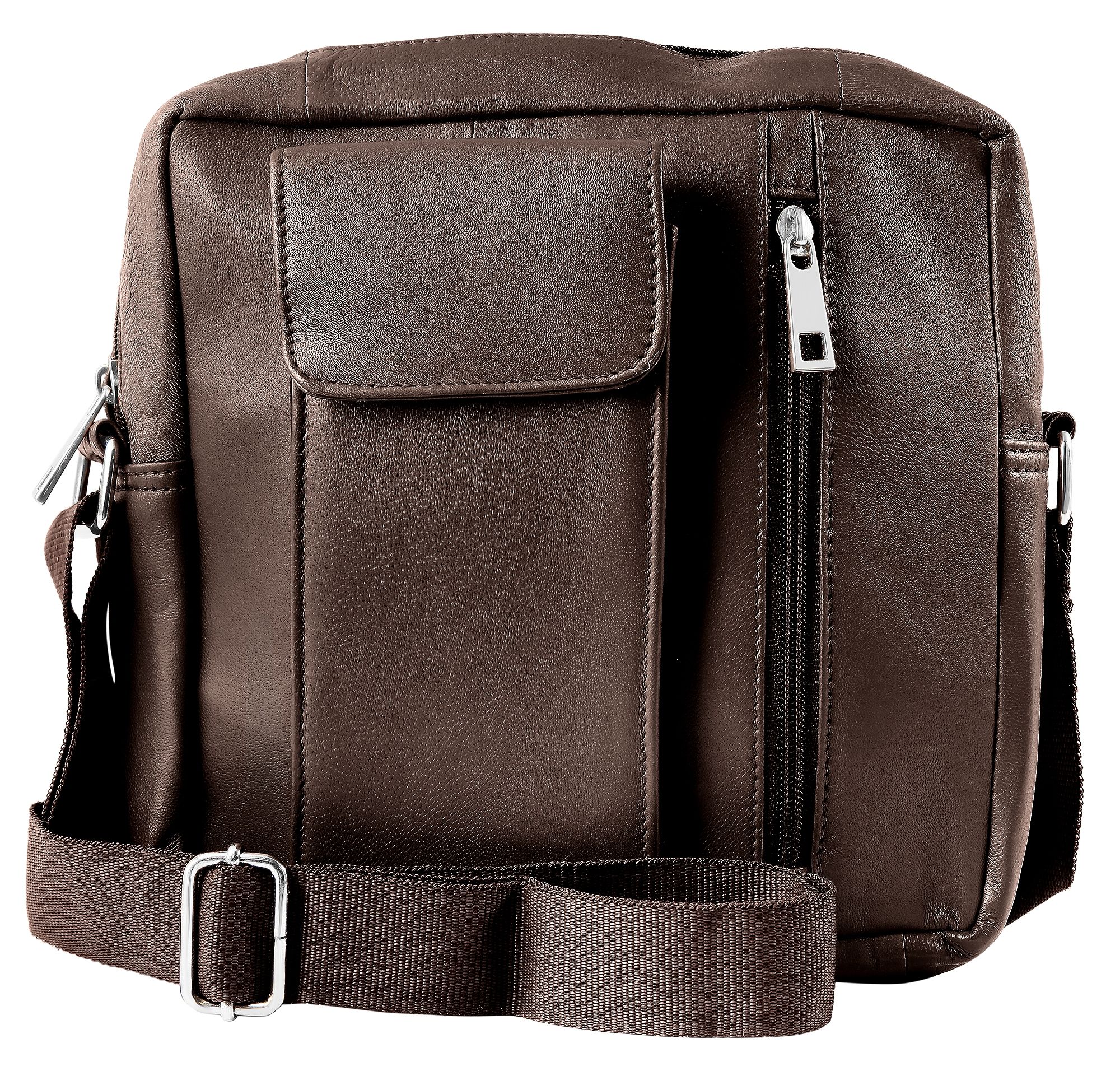 De donkerbruine schoudertas van het merk Akzent is gemaakt van echt leer en heeft een glad oppervlak. Hij heeft ook een 3 cm breed nylon handvat dat kan worden versteld tot een maximale lengte van ongeveer 130 cm. De twee buitenvakken en het binnenste hoofdvak zijn toegankelijk met een rits. De tas heeft ook een vak voor een mobiele telefoon met drukknoopsluiting aan de buitenkant, dat geschikt is voor mobiele telefoons tot de maat iPhone 15 en iPhone 15 Pro. Deze stijlvolle tas is een tijdloze allrounder die je bij veel gelegenheden kunt dragen. De mogelijkheid om al je belangrijke spullen in op te bergen is ook indrukwekkend. Of je nu gaat wandelen, winkelen of een uitstapje maakt - deze handtas is de ideale metgezel gemaakt van duurzame materialen. De ongevulde tas is 24 cm lang, 23 cm breed en 2,5 cm dik.