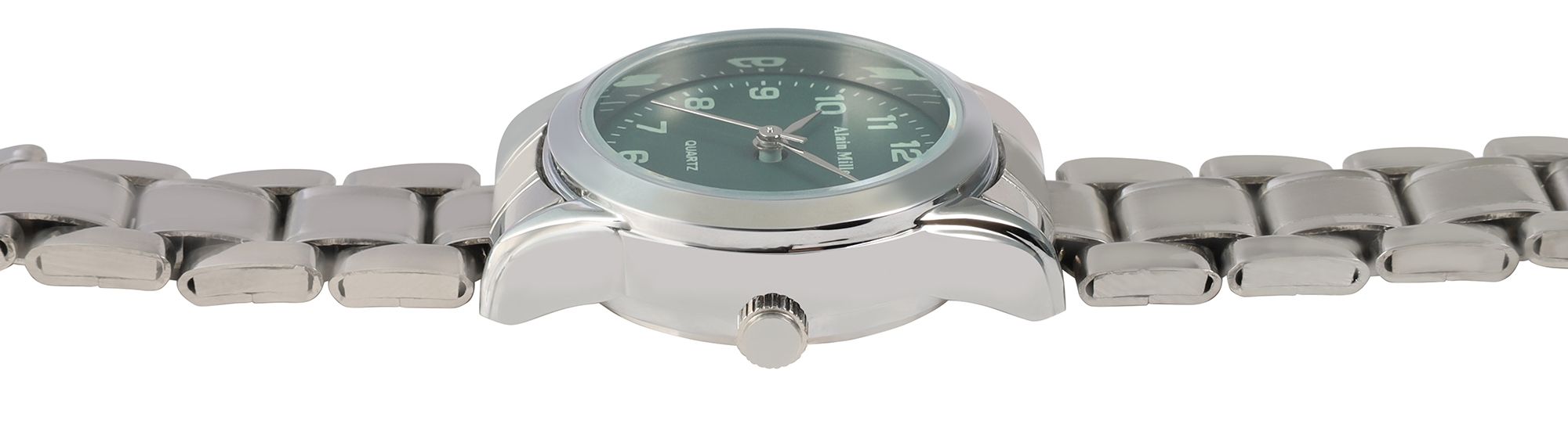 Variant 1 - zilverkleurige roestvrij stalen schakelarmband, zilverkleurige kast, groene wijzerplaat met witte indexkleur