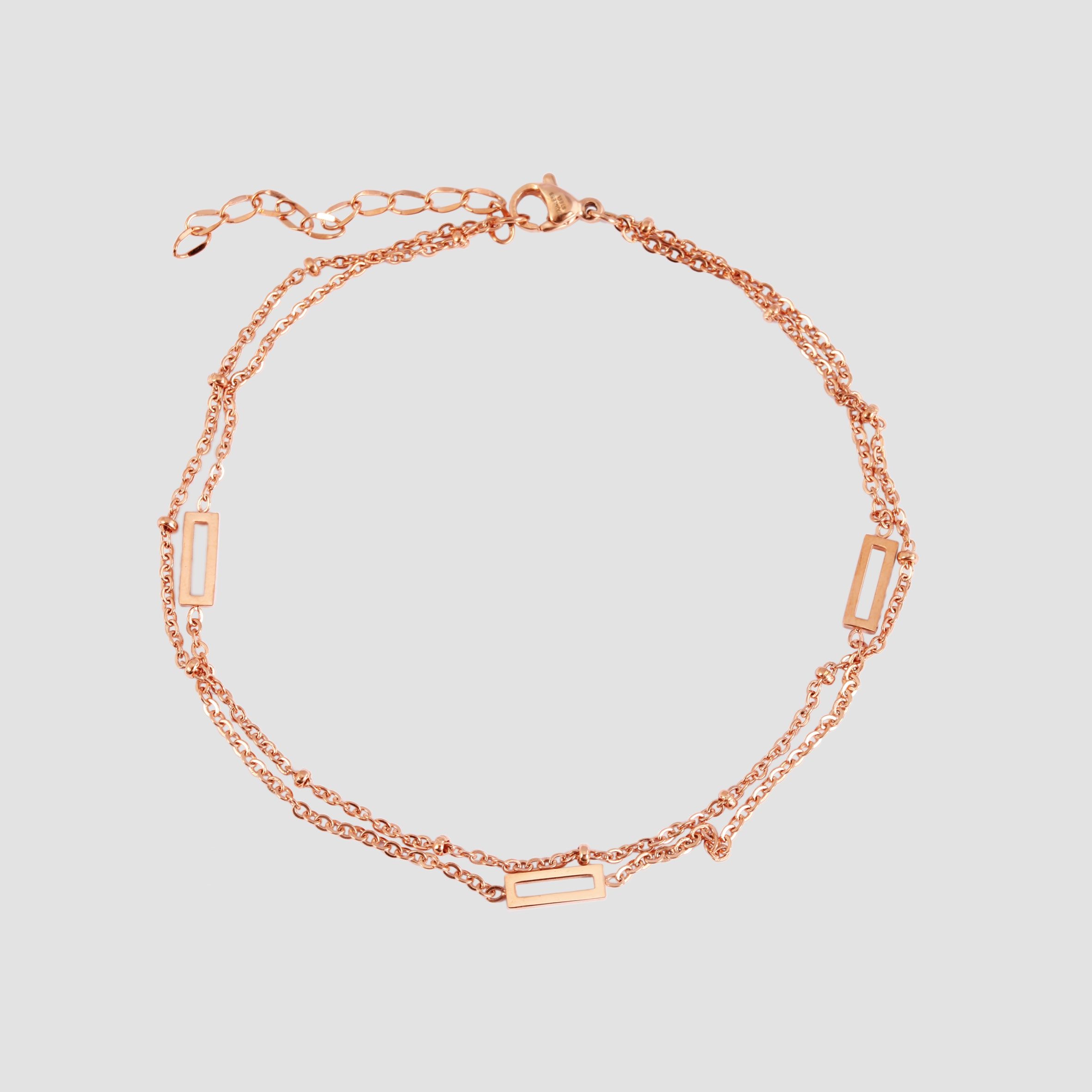 Dit elegante enkelbandje van hoogwaardig roestvrij staal in koele zilverkleur, zilverkleur met zwart accent of warme roségoudkleur met een lengte van 24 cm en een breedte van 6 mm met een dikte van 2 mm wordt gekenmerkt door het ontwerp met dubbele rijen in een ankerkettingpatroon: twee delicate roestvrijstalen kettinkjes die de enkel stijlvol strelen.
