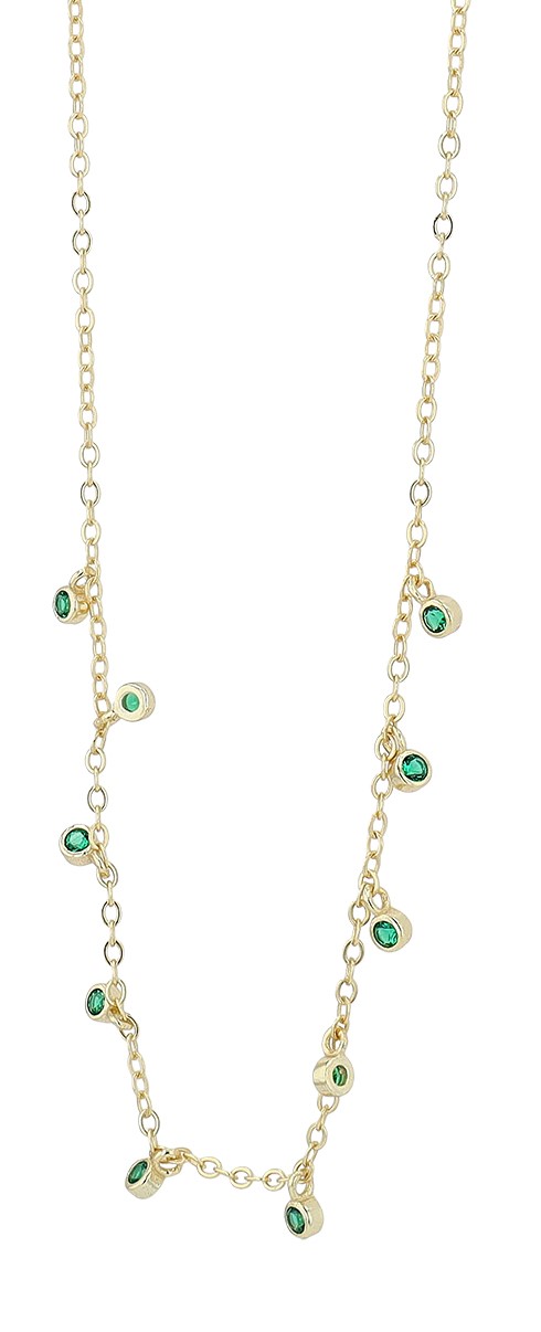 In het midden van de ketting zitten 10 kleine hangers, die gelijkmatig verdeeld zijn over de 10 cm lengte van de ketting. Elke hanger heeft een diameter van 2,5 mm en is bezet met een kleurrijke zirkoon.