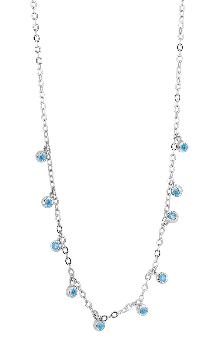 In het midden van de ketting zitten 10 kleine hangers, die gelijkmatig verdeeld zijn over de 10 cm lengte van de ketting. Elke hanger heeft een diameter van 2,5 mm en is bezet met een kleurrijke zirkoon.