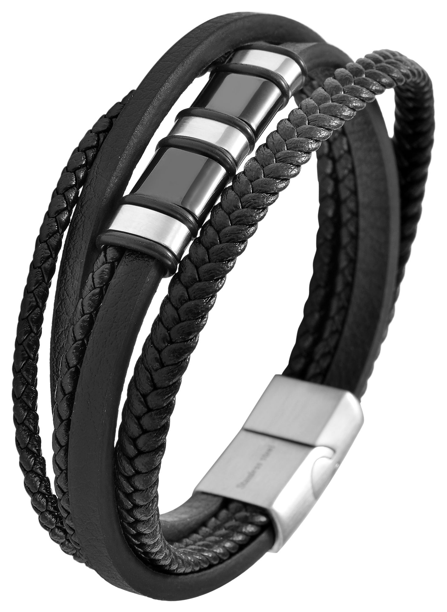 De zwarte armband van het merk Akzent is gemaakt van imitatieleer en is verkrijgbaar in lengtes van 19 cm, 21 cm en 23 cm, elk met een breedte van 13,5 mm en een dikte van 8 mm. De armband met vijf rijen bestaat uit twee gevlochten koorden van imitatieleer, één gevlochten band en twee gladde banden. In het midden zitten zwarte en zilverkleurige roestvrijstalen elementen, van elkaar gescheiden door rubberen ringen, die het ontwerp van de armband harmonieus samenbrengen en ook perfect zijn voor kleine gravures.