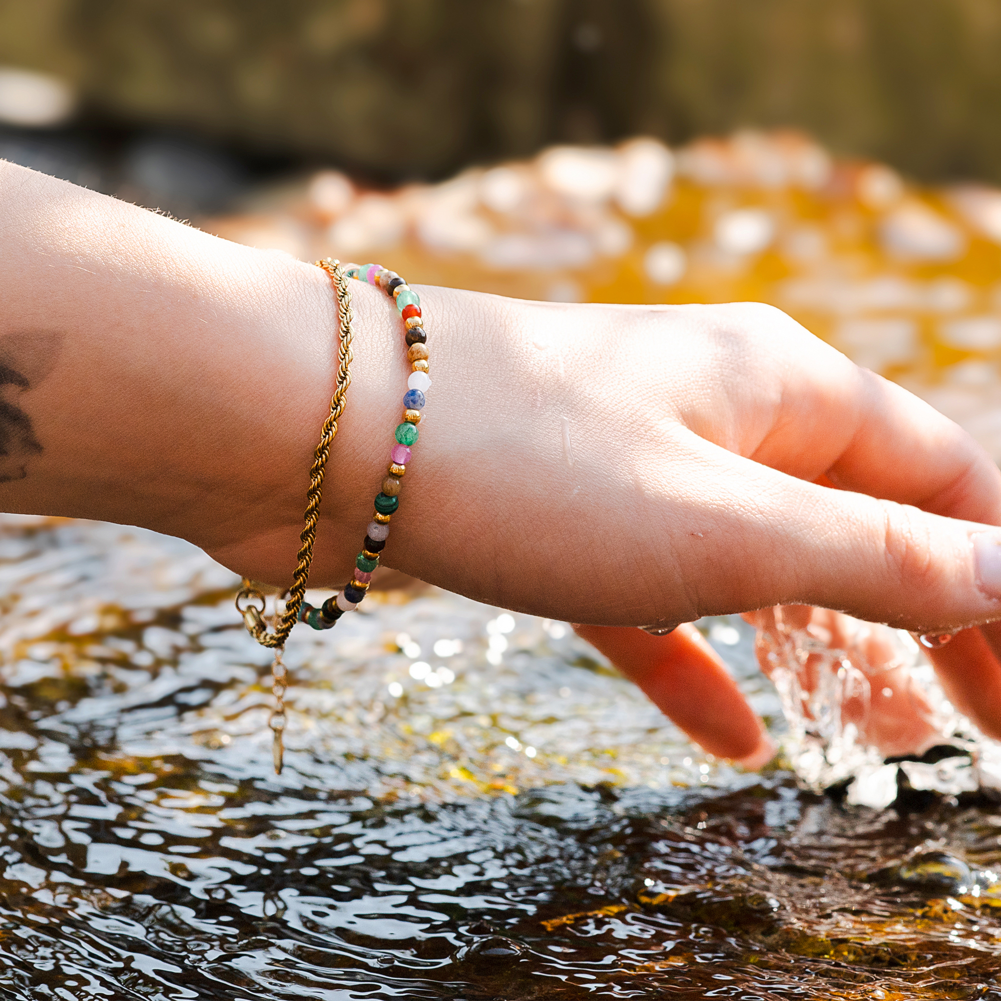 Met een lengte van 18,5 cm en een extra verlenging van 5 cm biedt deze armband een pasvorm op maat en is hij comfortabel om te dragen. De sluiting, een praktische karabijnsluiting, zorgt voor een stevige bevestiging en maakt het aan- en uitdoen gemakkelijk.