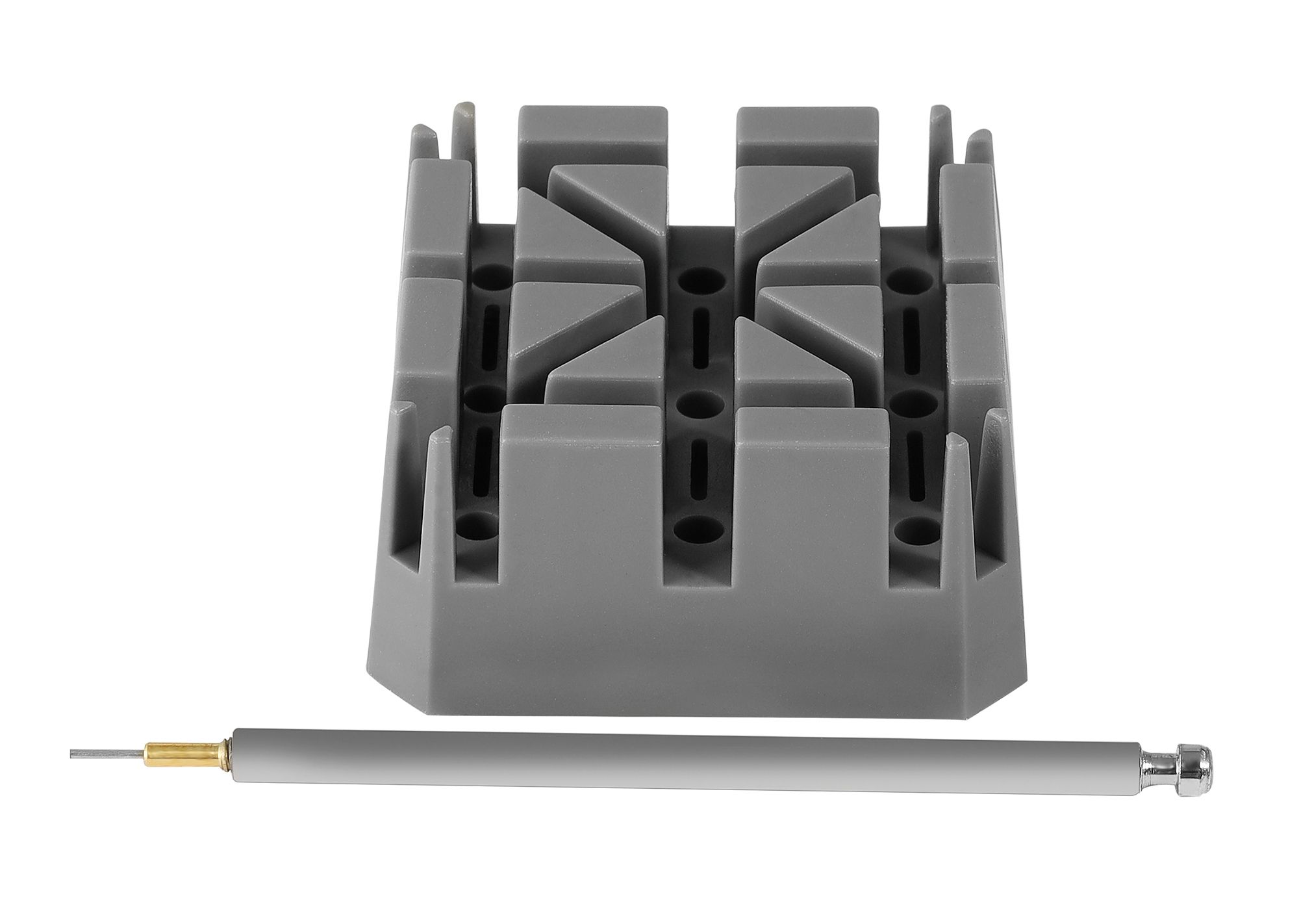 Met de praktische kunststof bandverkorter kun je eenvoudig horlogebandjes inkorten. Het horlogebandje wordt rechtop in een van de zeven inkepingen van verschillende grootte geplaatst. Met de meegeleverde roestvrijstalen pinnenklopper kunnen de pinnen professioneel met een hamer van het horlogebandje worden verwijderd. Het maakt niet uit of de armband van metaal, roestvrij staal, hout, keramiek of kunststof is, omdat het gereedschap van kunststof is, is het zeer zacht voor het materiaal. Het is mogelijk om armbanden tot een dikte van ongeveer 6 mm in te korten. De meegeleverde ponstip heeft een diameter van 1 mm. De armbandverkorter heeft een lengte van 50,7 mm, een breedte van 51,4 mm en een hoogte van 25 mm. Dit apparaat is een veilige optie voor het aanpassen van horlogebandjes aan de bijbehorende scharnierbreedte.