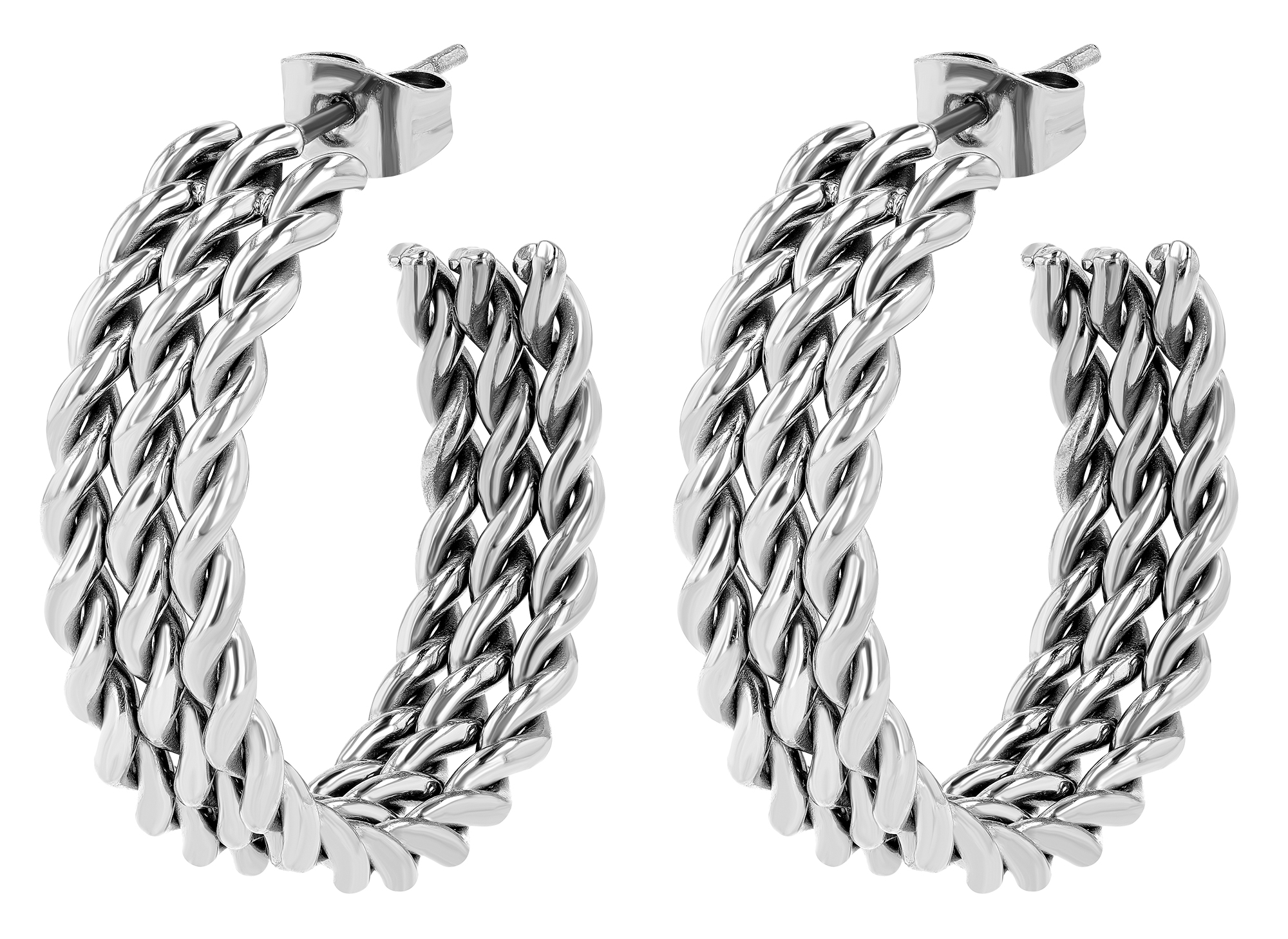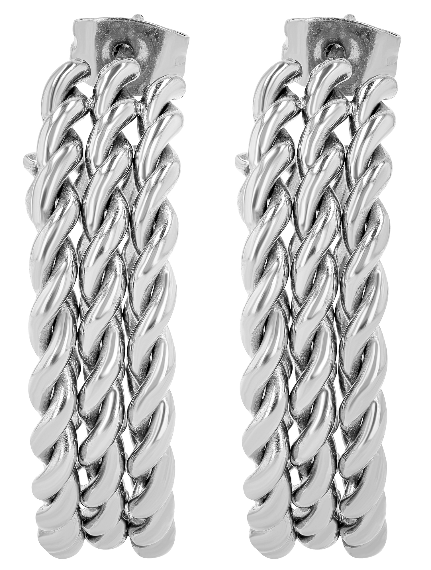 Het unieke ontwerp maakt indruk met een trendy, moderne look waarin drie gedraaide strengen elegant aan elkaar zijn geregen. Deze structuur geeft de creool een ongebruikelijke textuur en maakt het een veelzijdig accessoire. Ze zijn verkrijgbaar in zowel een klassieke zilverkleurige look als een luxe goudkleurige afwerking. Gemaakt van robuust roestvrij staal, zijn deze oorbellen duurzaam en vriendelijk voor de huid. Met een binnendiameter van 24 mm behoren ze tot de meer in het oog springende sieraden en zijn ze meteen een blikvanger. De dikte van 2,5 mm en een totale breedte van 7,5 mm geven ze een hoogwaardige uitstraling. De veilige sluiting garandeert een comfortabele pasvorm en maakt het aan- en uittrekken gemakkelijk.