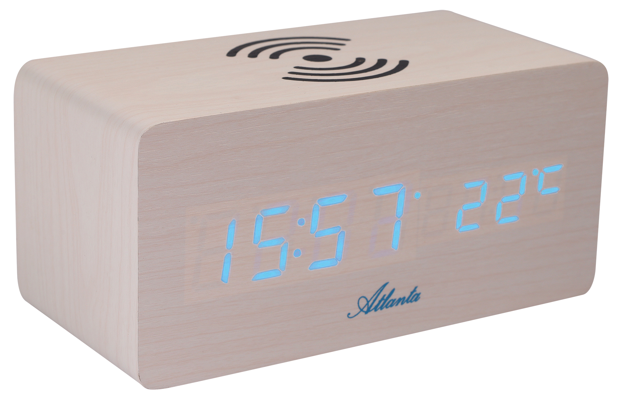 Productinformatie "Atlanta LED Wecker (Wireless-Charging, 3 Alarmzeiten, Temperatur), Holz/ weiß"