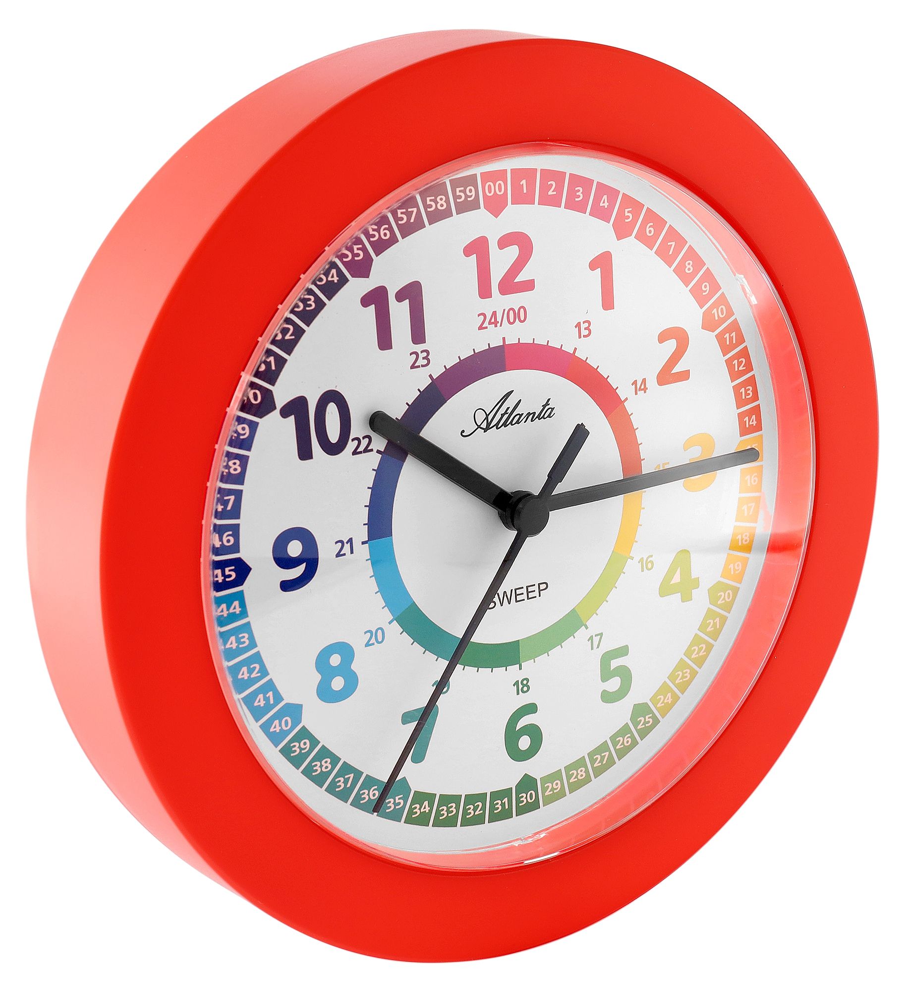 Onze Atlanta wandklok voor kinderen is niet zomaar een klok, maar een geweldig hulpmiddel waarmee kinderen spelenderwijs de tijd leren zien. Met een diameter van 22 cm is deze klok opvallend en past hij perfect in elke kindvriendelijke omgeving. De felrode kleur van de kast en de witte wijzerplaat zijn een blikvanger in elke kinderkamer. De kleurrijke cijfers op de wijzerplaat maken het aflezen van de tijd tot een leuk avontuur. De minuten hebben dezelfde kleur als de uren, waardoor het voor kinderen gemakkelijker wordt om de tijd nauwkeurig af te lezen.