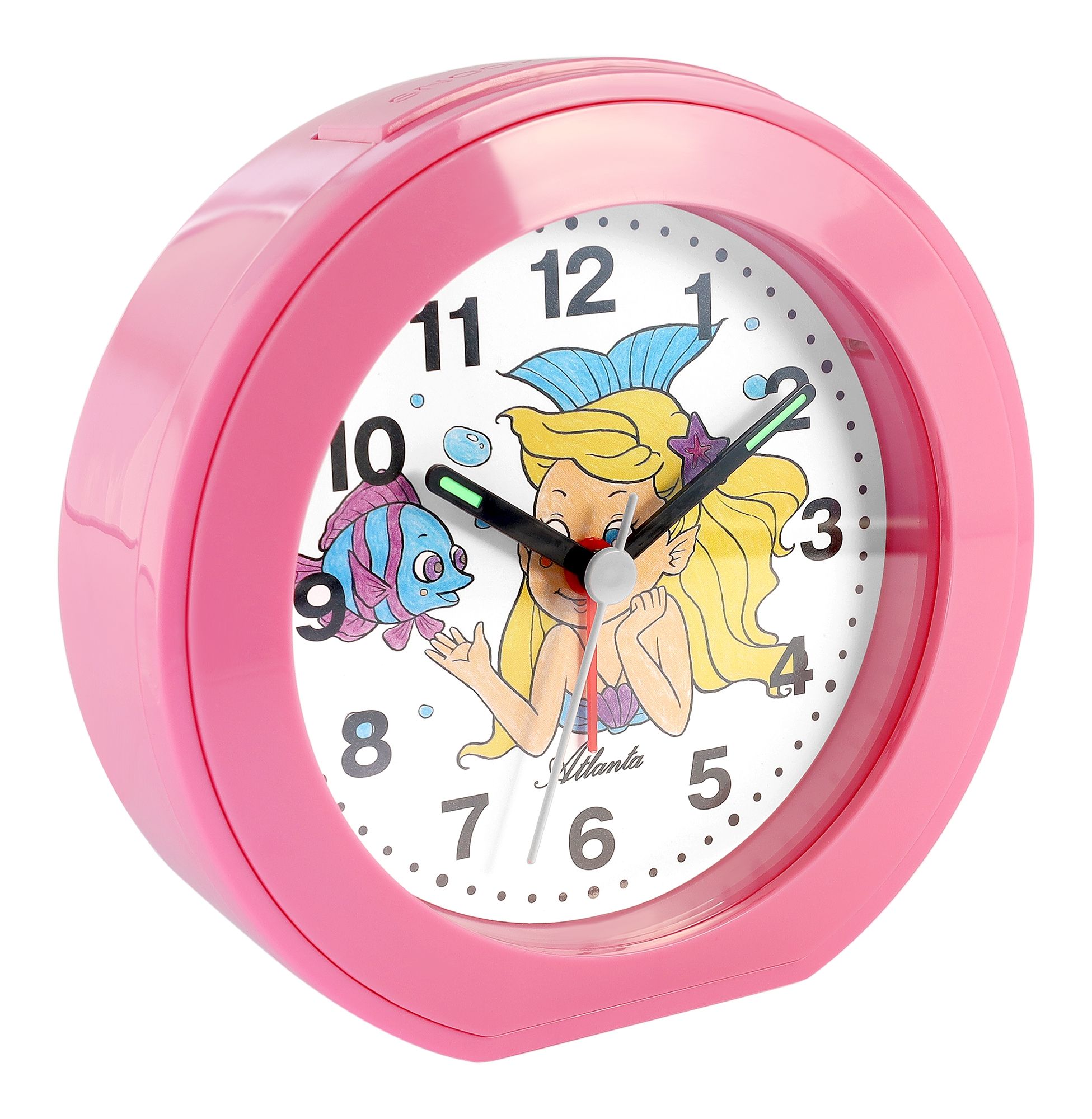 De Atlanta kwartswekker is niet zomaar een uurwerk, maar een betoverend kunstwerk voor kinderen. Met zijn afmetingen van 12,7 x 13,1 x 4,2 cm is deze wekker compact en past hij perfect op elk nachtkastje of bureau. Door de roze-kleurige kunststof behuizing is deze wekker een blikvanger in elke kinderkamer. Op de witte wijzerplaat staat een zeemeermin in verschillende kleuren die de fantasie van je kind zal inspireren. De zwarte Arabische cijfers en puntindexen maken het snel en gemakkelijk om de tijd af te lezen.