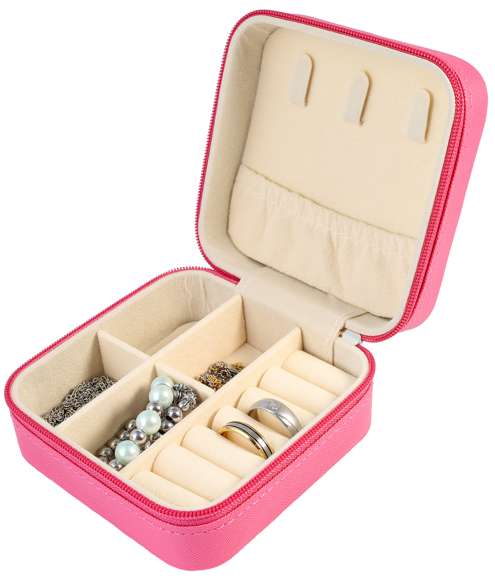 De indeling van de sieradendoos is bijzonder praktisch. Hij is verdeeld in een onderkant voor 6 ringen en 4 paar oorbellen of armbanden en een bovenkant voor 3 kettingen met of zonder hangers, die veilig kunnen worden opgeborgen met behulp van drie haken en een vakje met een elastische band. Een ritssluiting houdt het opbergdoosje bij elkaar en sluit het veilig af. Deze trouwe metgezel is verkrijgbaar in verschillende kleuren.