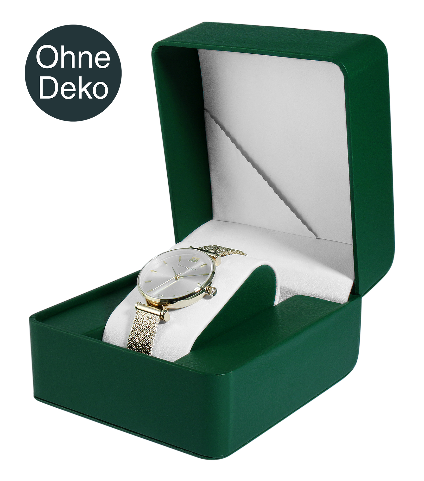 Productinformatie "Aufklappbare Uhrenbox mit Kissen, Lederimitat, 11 x 10 x 7 cm, dunkelgrün"