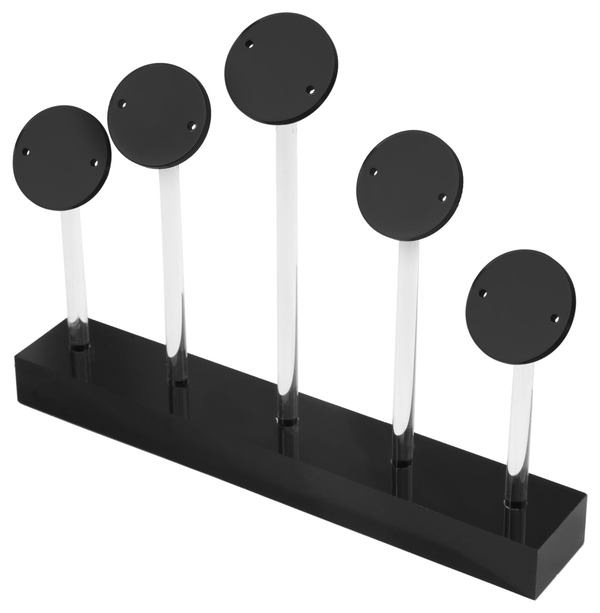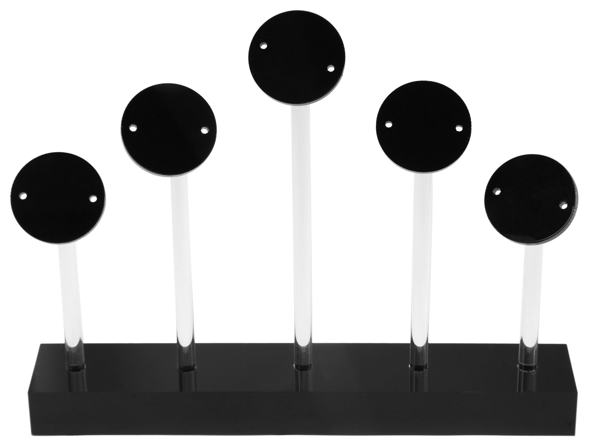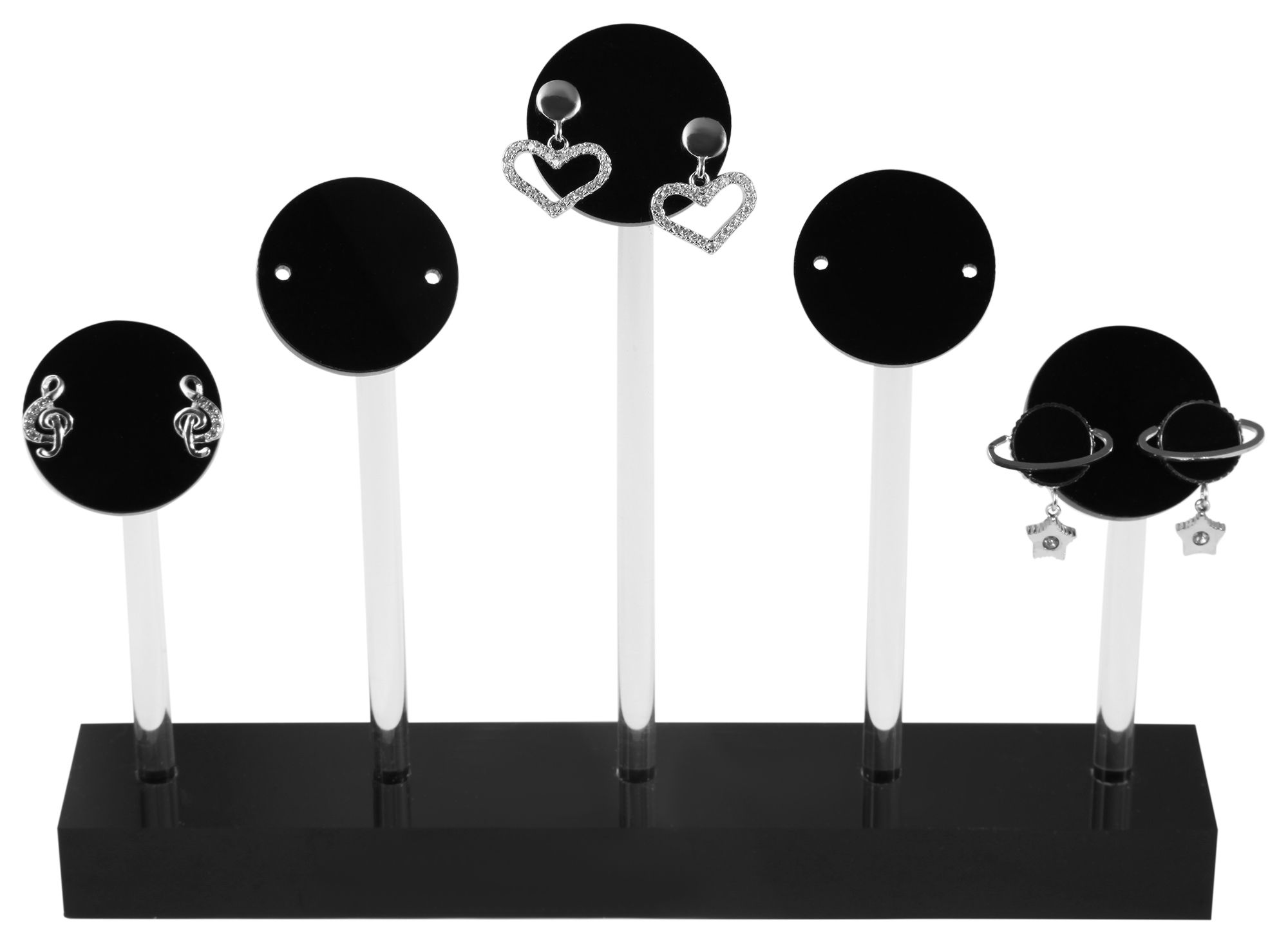 Als je je oorbellen op een eenvoudige maar elegante manier wilt presenteren, dan is deze zwarte standaard echt iets voor jou. Je hebt maar een paar eenvoudige stappen nodig om hem op te zetten. Hij bestaat in totaal uit zes onderdelen. De basis en de vijf zuilen waaraan de oorstekers bevestigd kunnen worden. Hij biedt plaats aan 5 oorbellen. Ideaal voor elke etalage (zonder decoratie). De zuilen zijn gemaakt van perspex. Afmetingen L:15 x B: 2,5 x D: 1,5 cm