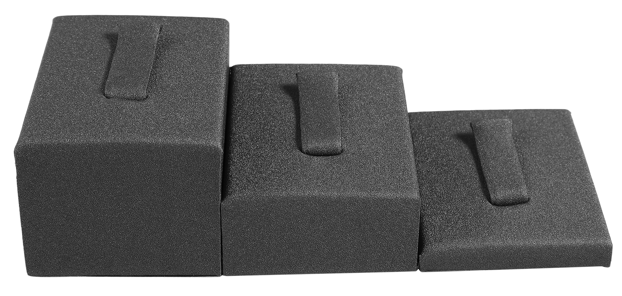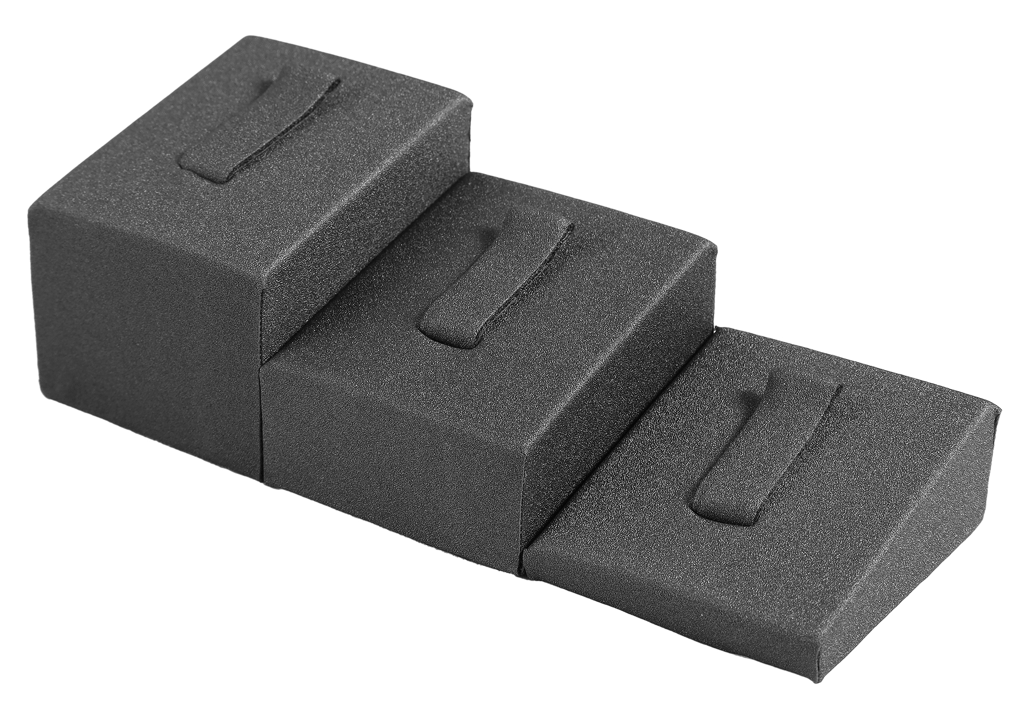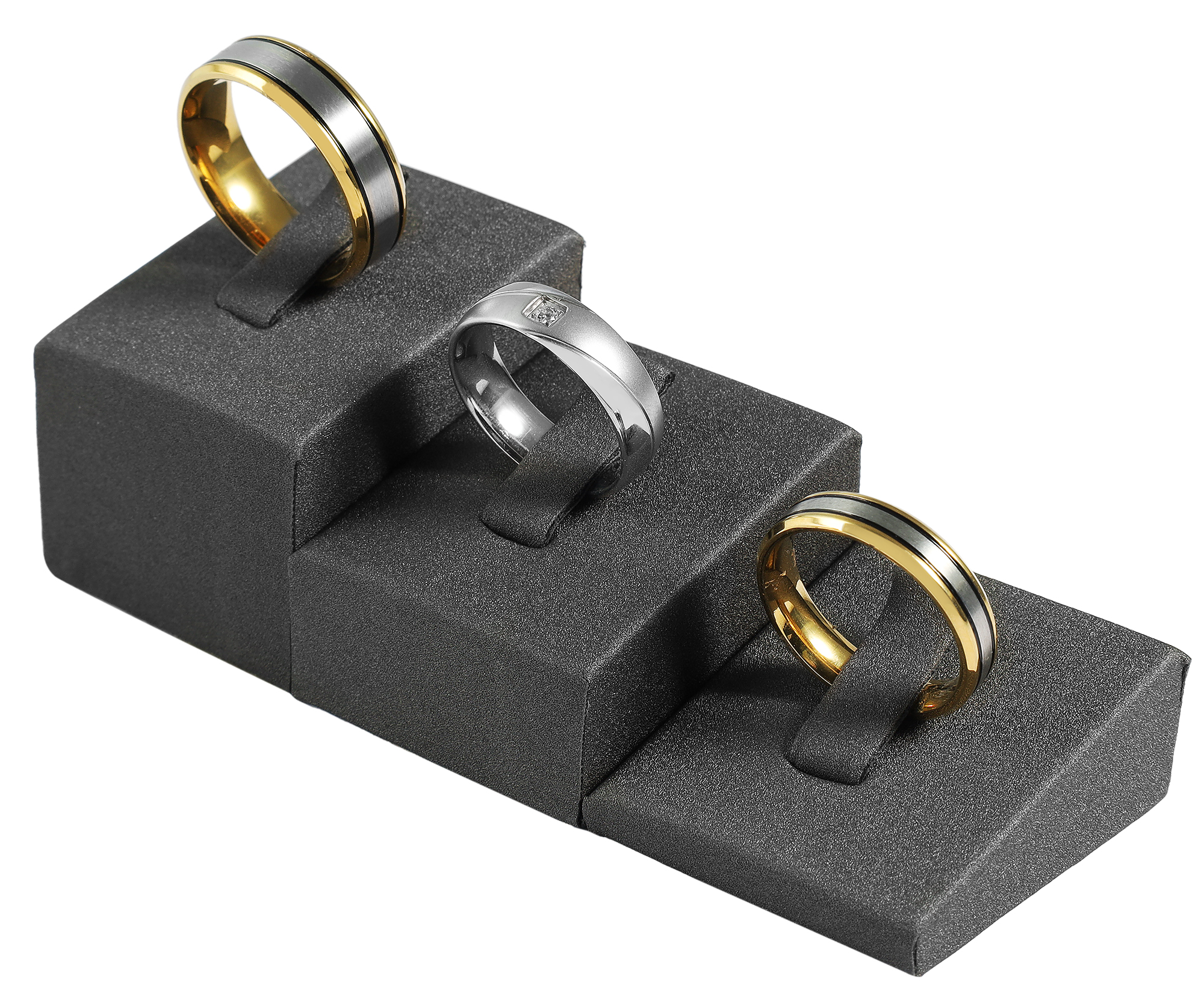 Deze eenvoudige wigvormige designstandaards in drie verschillende kleuren, zwart, grijs of wit, hebben een minimalistisch, modern ontwerp en bevatten drie maten per set. Door deze speciale opstelling en dit ontwerp komen je ringen het best tot hun recht.