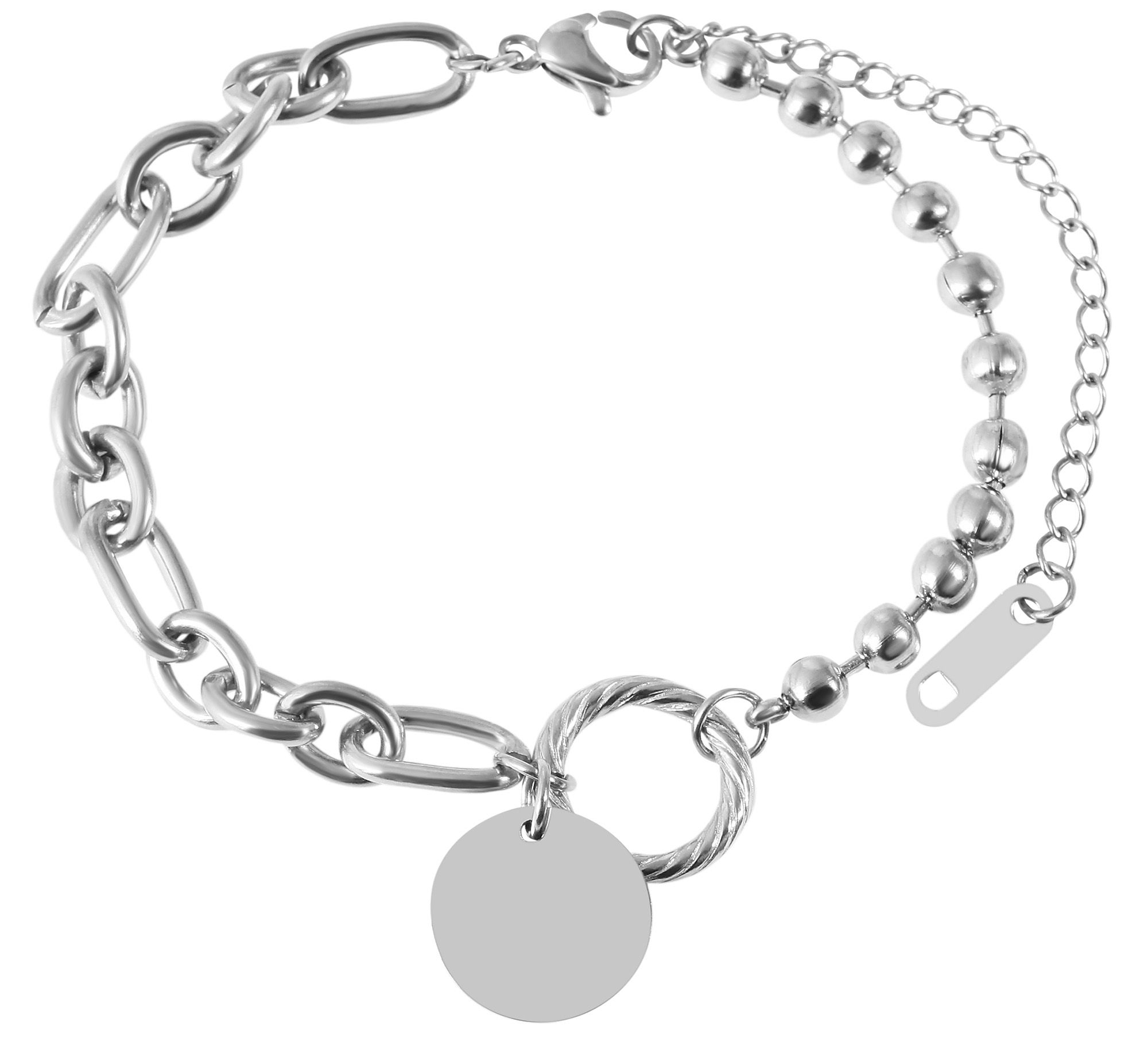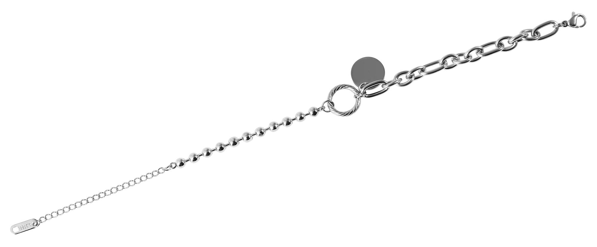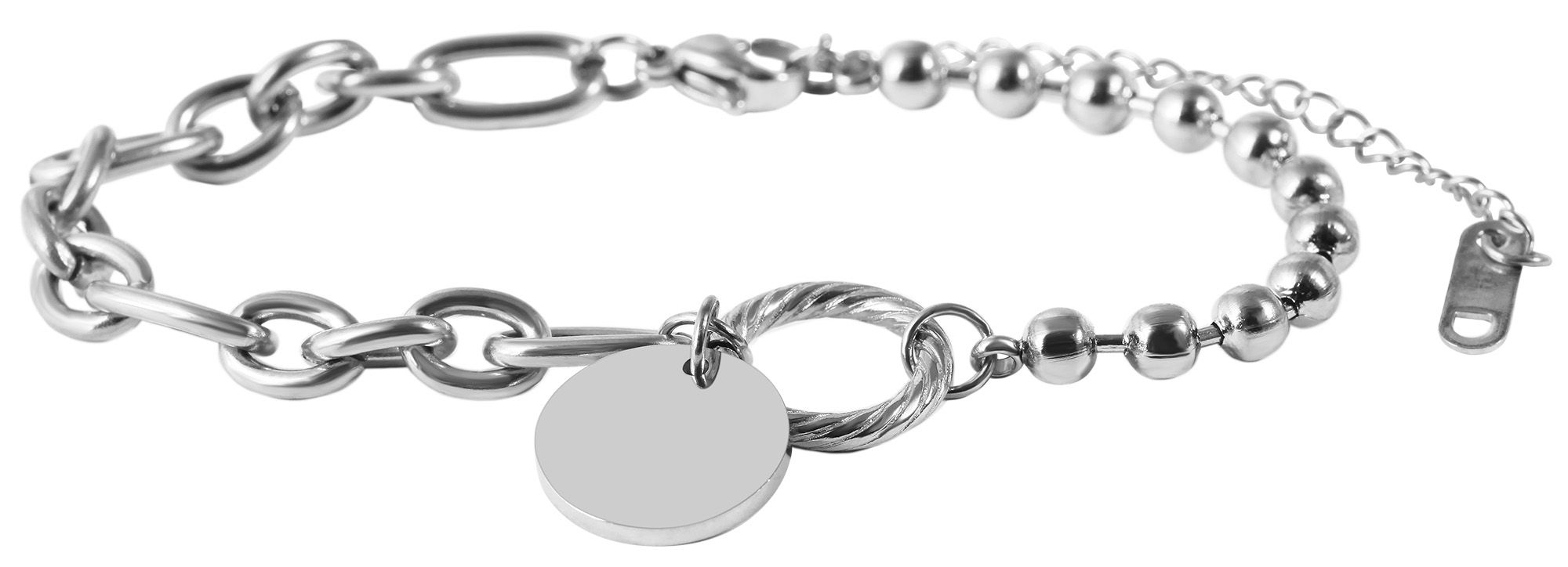 Deze verfijnde sieradenarmband van het merk Akzent is gemaakt van roestvrij staal. Hij heeft een lengte van 17 cm en kan individueel met 3 cm worden verlengd dankzij een verlengkettinkje. De armband bestaat uit verschillende soorten kettingen. De combinatie van een bolletjesketting en een Figaro ankerketting maakt de armband tot een echte blikvanger die snel een vast onderdeel van je pols zal worden. De verschillende kettingen worden bij elkaar gehouden door een ronde hanger in het midden, waaraan een gegraveerde munt is bevestigd. De munt biedt genoeg ruimte om te worden gepersonaliseerd met allerlei gravures. Zo wordt de moderne armband al snel een mooi en gepersonaliseerd cadeau, bijvoorbeeld voor een jubileum, Valentijnsdag of trouwdag. Hij kan worden geopend en gesloten met een roestvrijstalen karabijnsluiting. Dit product wordt geleverd op een wit juwelenkaartje. De afmetingen zijn 2,5 x 21 cm en ideaal om te presenteren in een passende display of om in te pakken als cadeau.