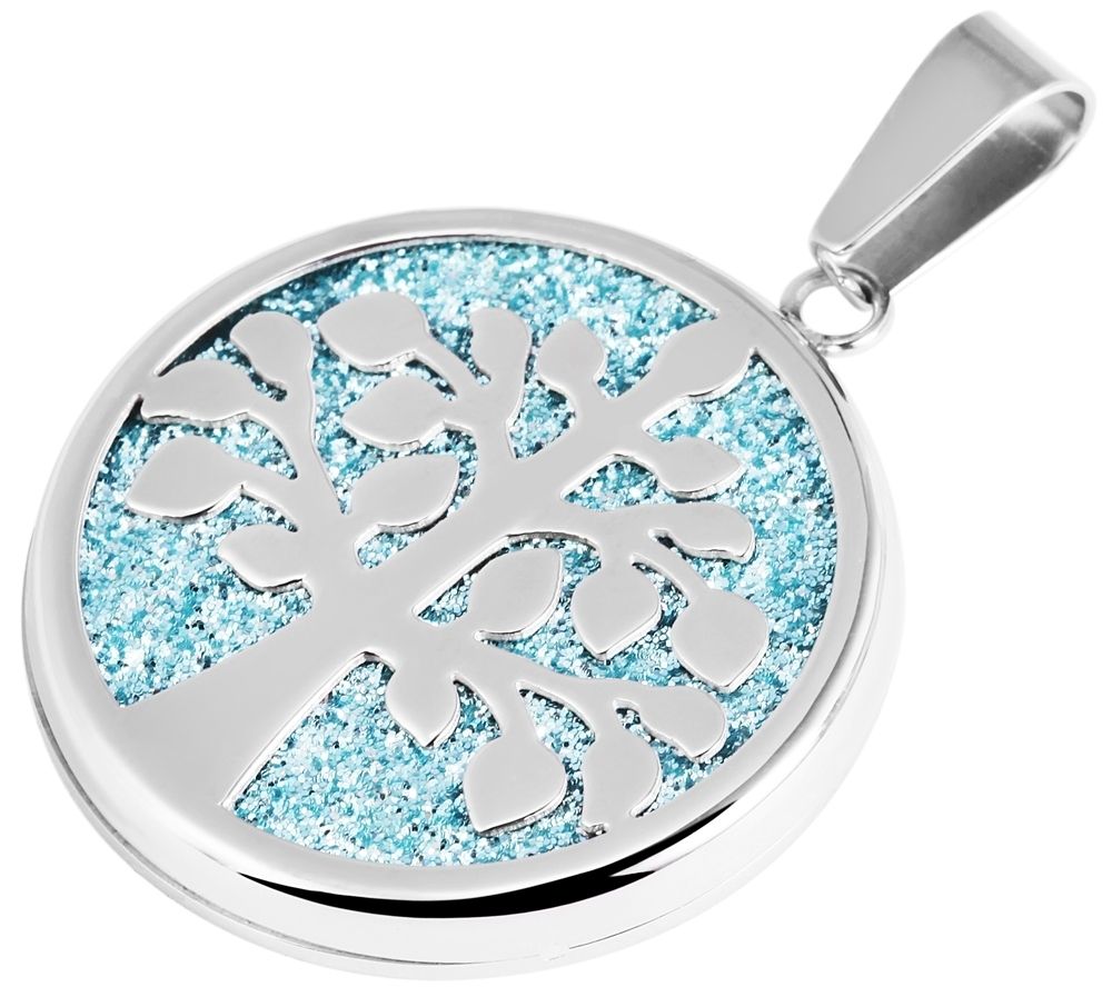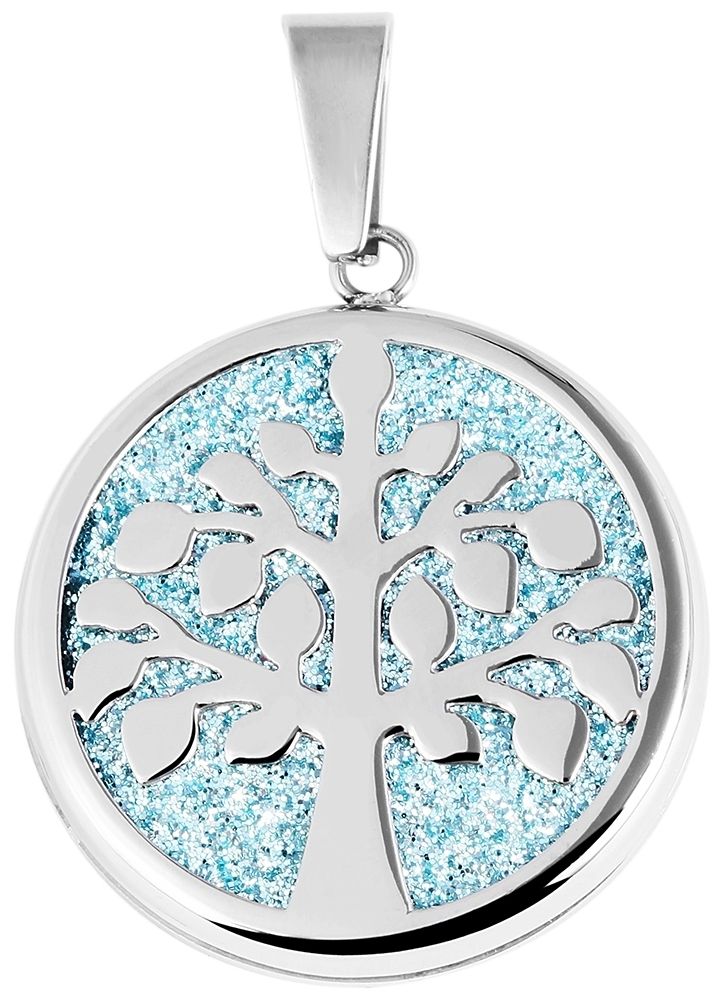 Productinformatie ""Baldrun" accent hanger van roestvrij staal, levensboom met lichtblauwe glitterlaag, zilverkleurig"