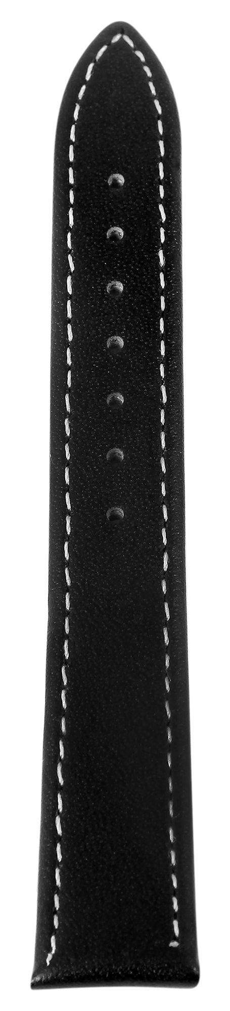 Vervangingsriem van echt leer in de kleur zwart. De buitenste naad is bijpassend wit. Het is gemaakt van rundleer. De riem heeft een brugbreedte van 16 mm, een gesp en twee riemlussen. Het gaatjesgedeelte loopt plat aan het uiteinde. De armbanden worden geleverd in een display. Het display is voorzien van 3 vervangende bandjes met een goudkleurige sluiting en 9 vervangende bandjes met een zilverkleurige sluiting.