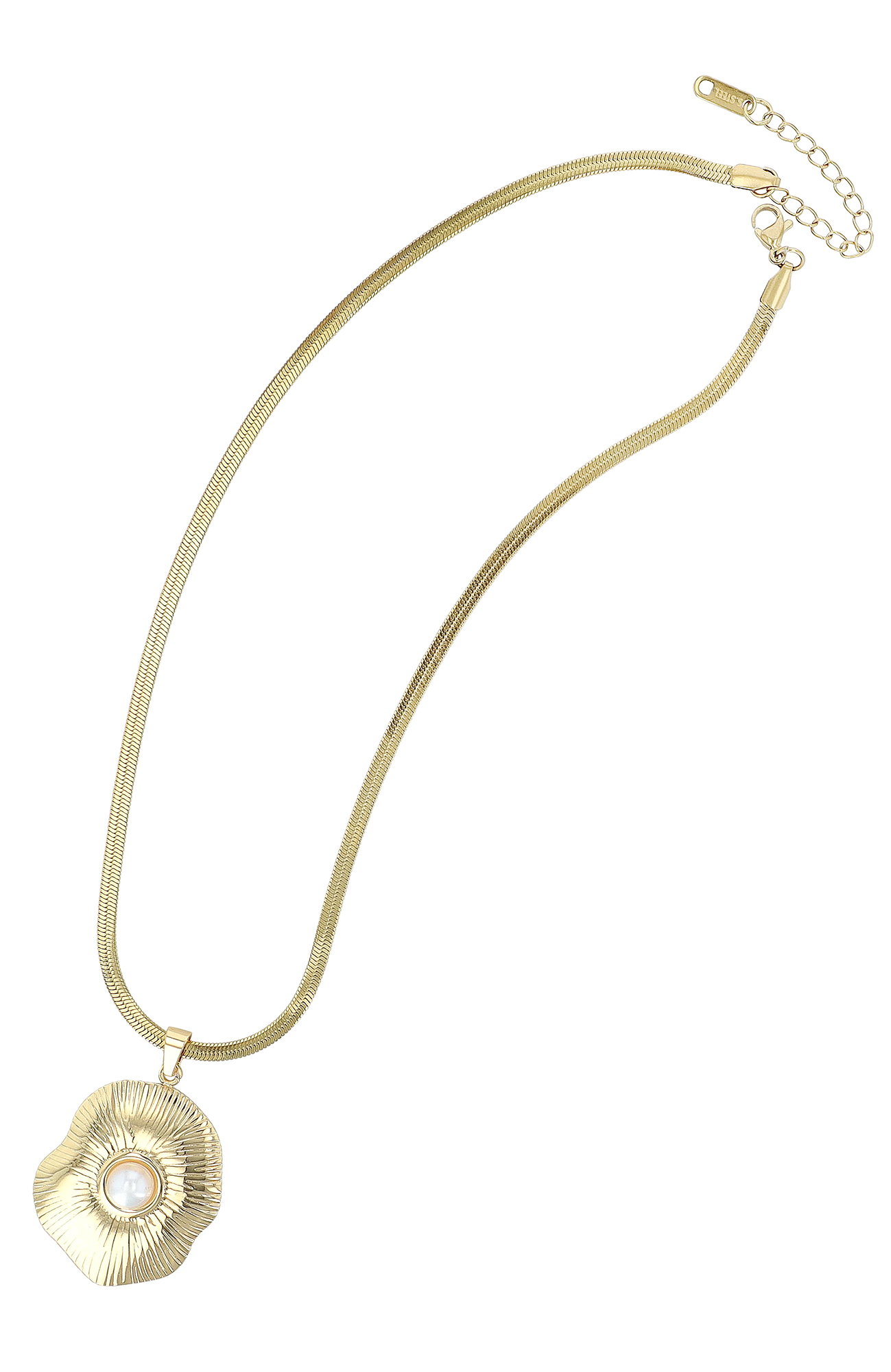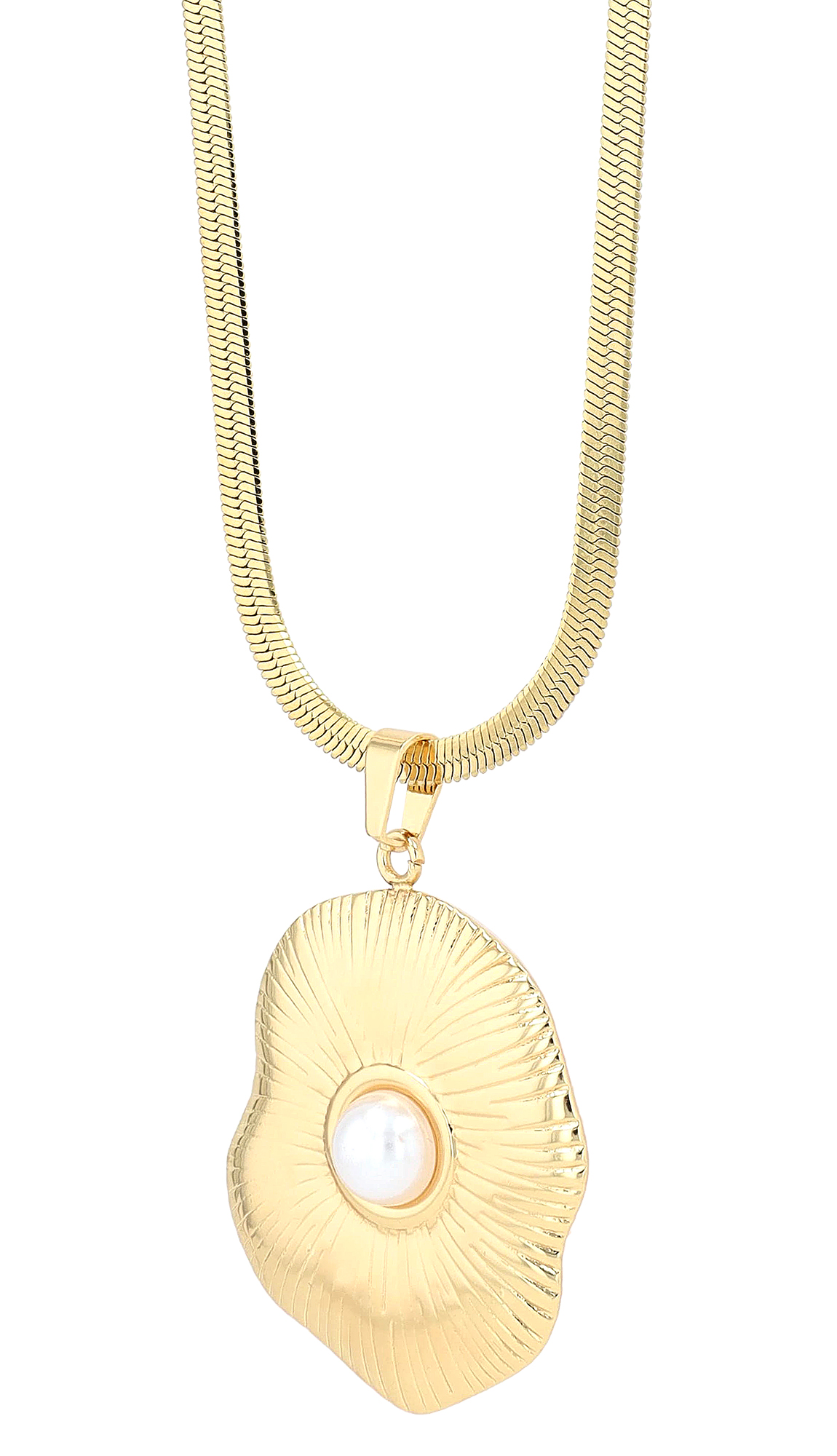De platte slangenketting heeft een lengte van 40 cm en kan worden aangepast dankzij de verlenging van 5 cm. Hij hangt elegant en is voorzien van een grote, organisch gestructureerde hanger (36 x 30 mm). Het middelpunt van de hanger is een glinsterende witte parel, die bijzonder elegant afsteekt tegen de goudkleurige groefstructuur.