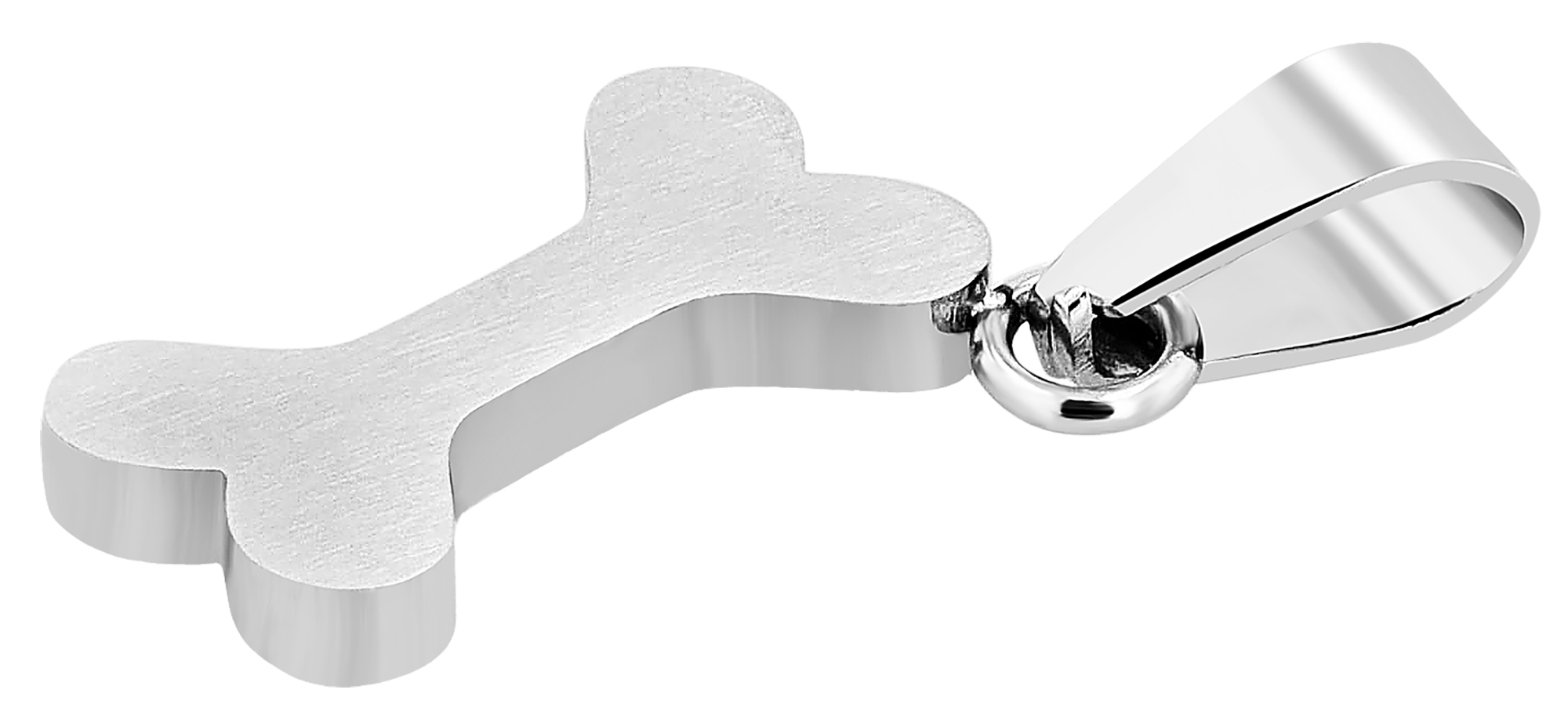 De hanger van het merk Akzent in de vorm van een botje is gemaakt van roestvrij staal en is zilverkleurig. Het oppervlak is mat. De hanger is 16 mm lang, 9 mm breed en 2 mm dik.