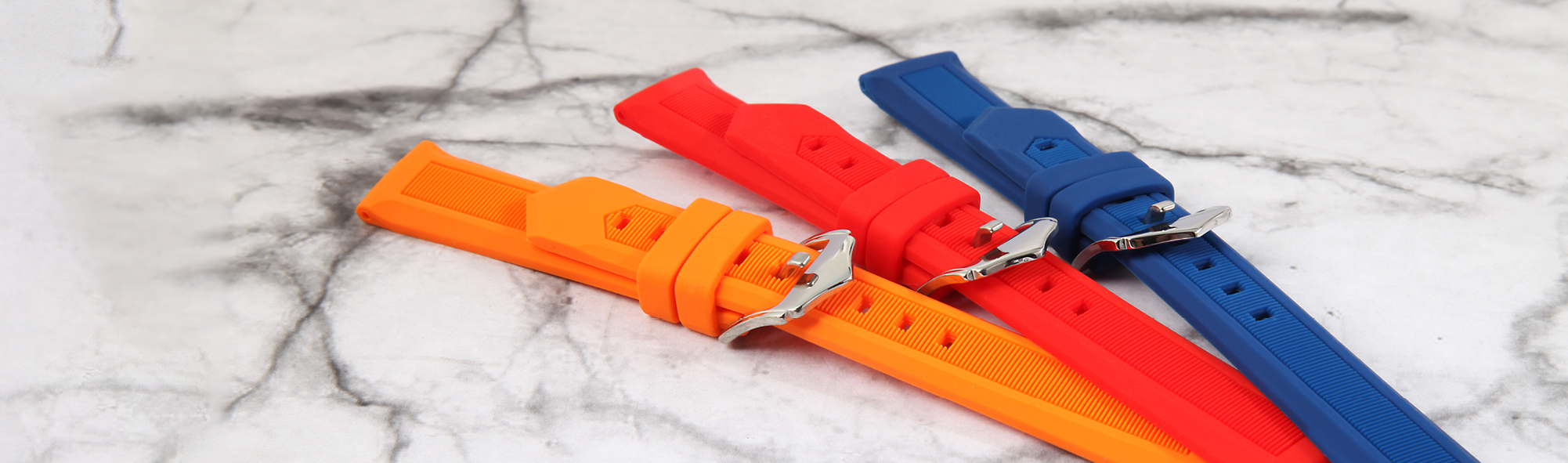 Het siliconen horlogebandje is zeer comfortabel om te dragen dankzij het zachte materiaal. Het oppervlak is geperforeerd met een fijn, nauwelijks zichtbaar ruitpatroon, dat een subtiele textuur creëert. Het materiaal heeft een robuuste dikte van 4 mm. Het is verkrijgbaar in de standaard nokbreedtes 18 mm, 20 mm en 22 mm.
