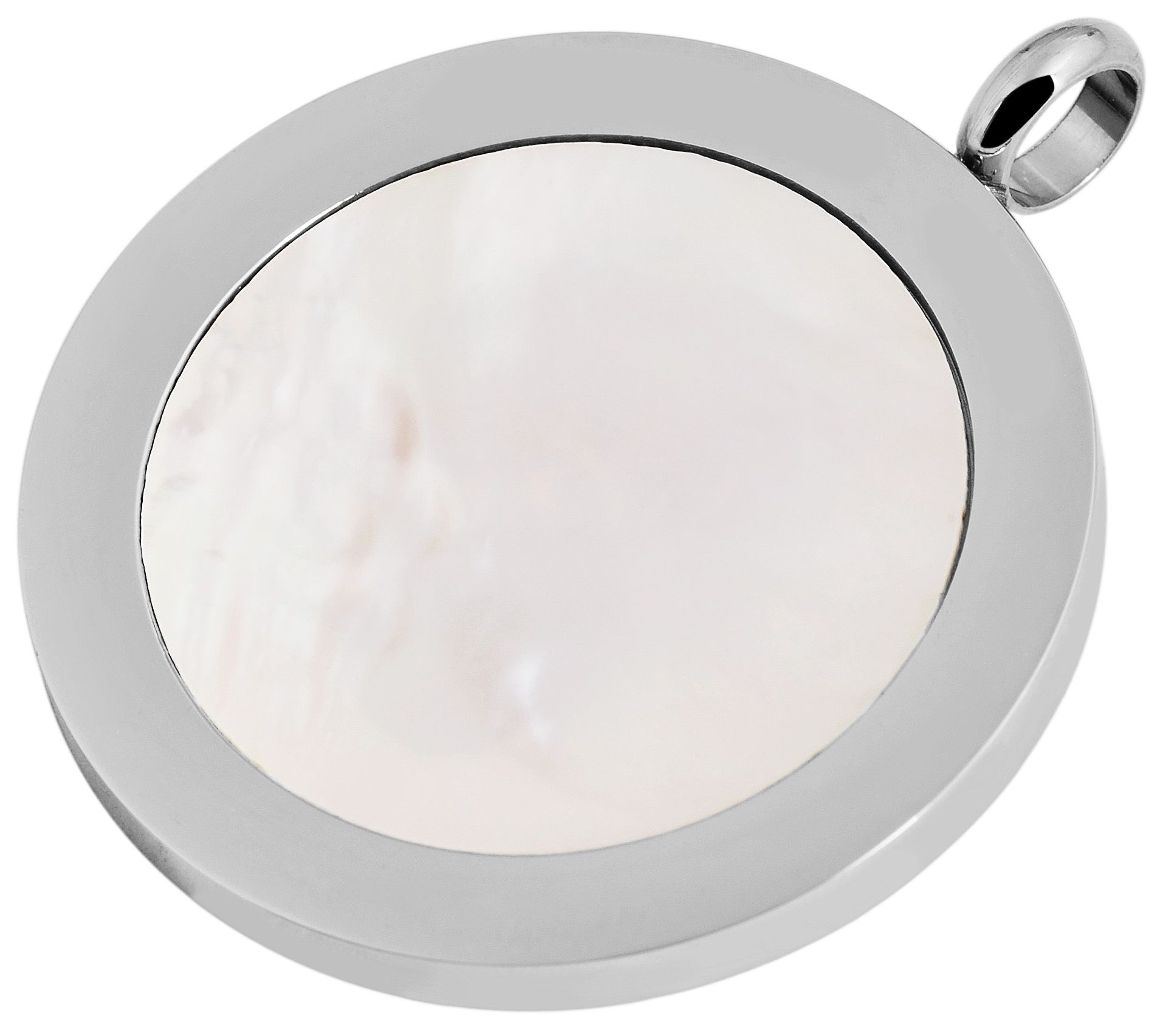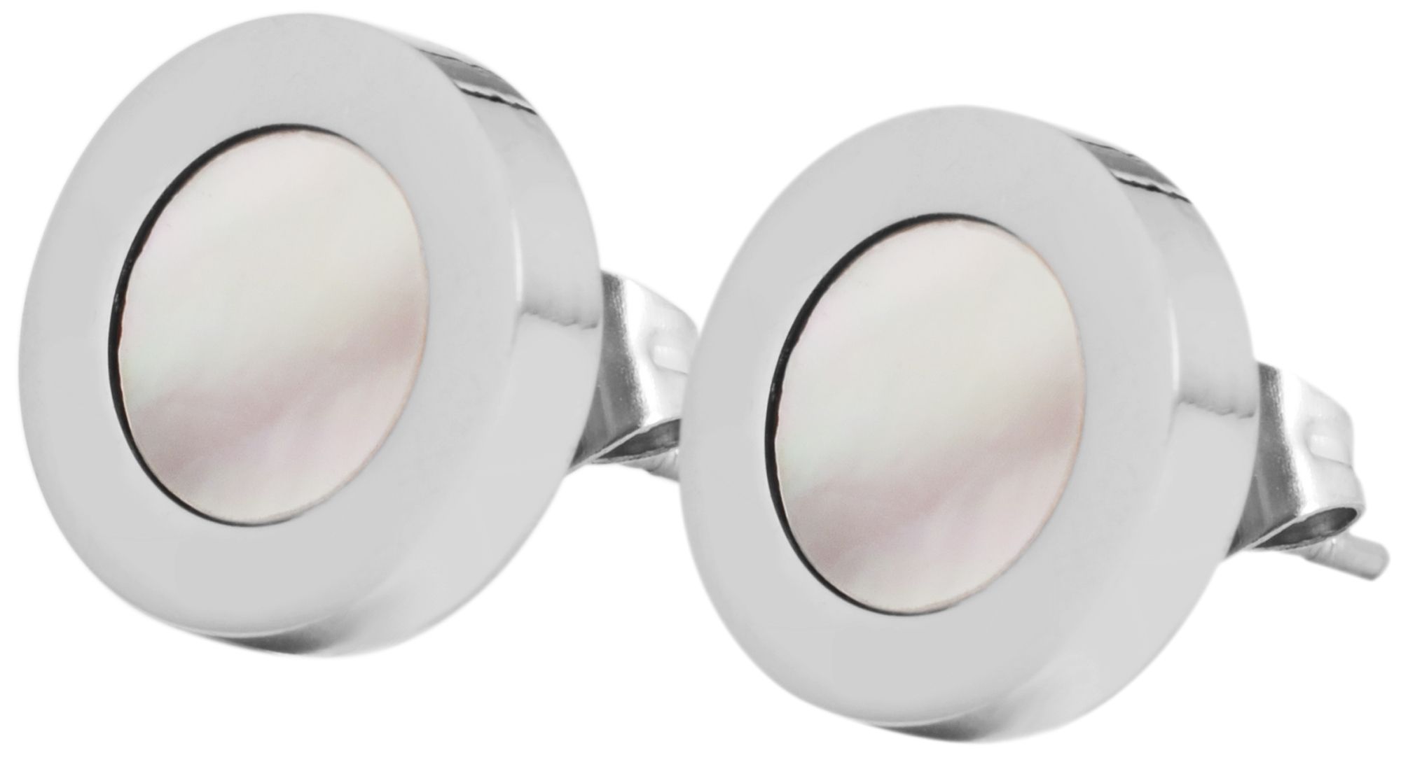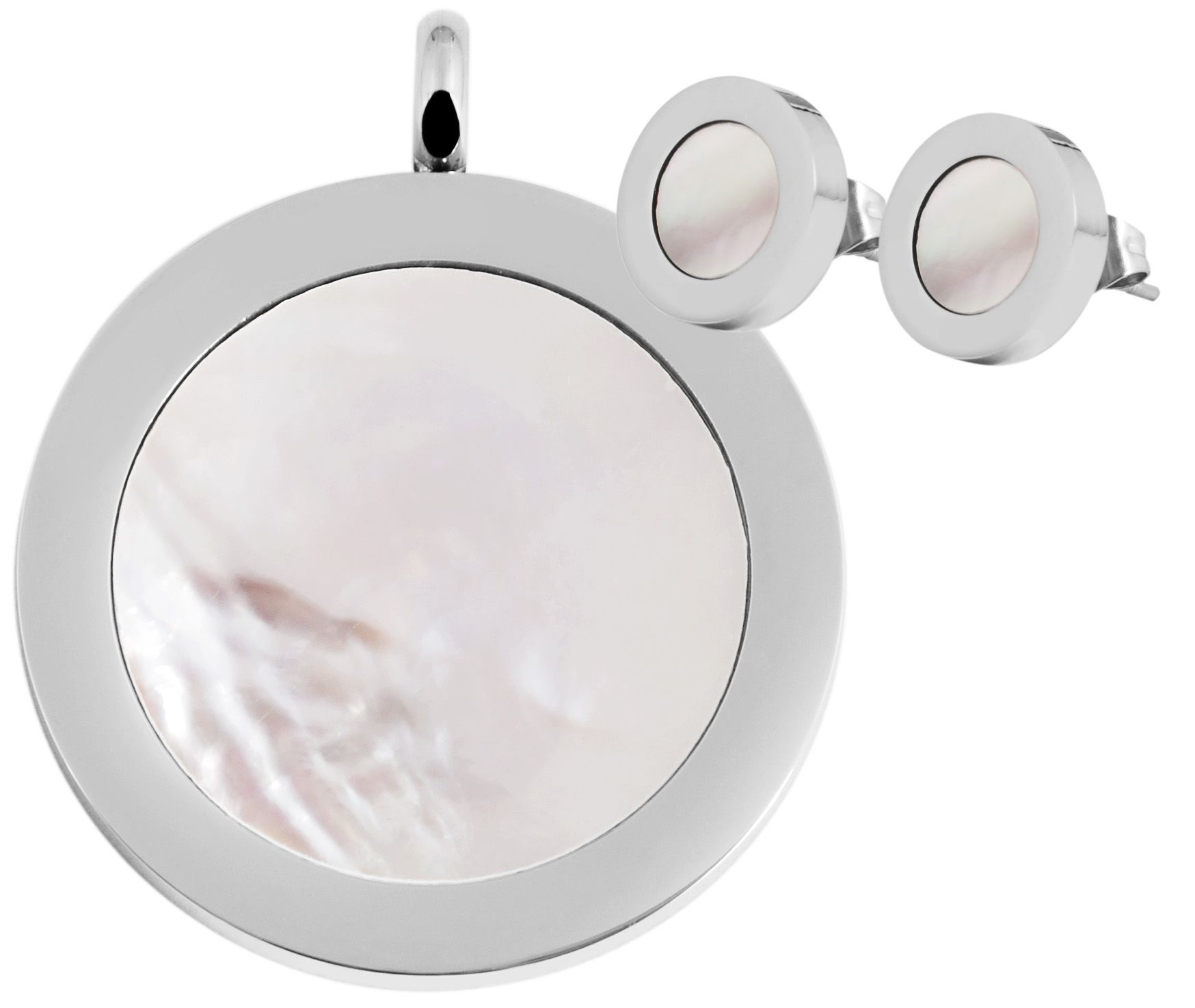 Deze moderne sieradenset bestaat uit een ronde hanger en bijpassende oorstekers, die indruk maken door het samenspel van koel roestvrij staal en glinsterend wit parelmoer.