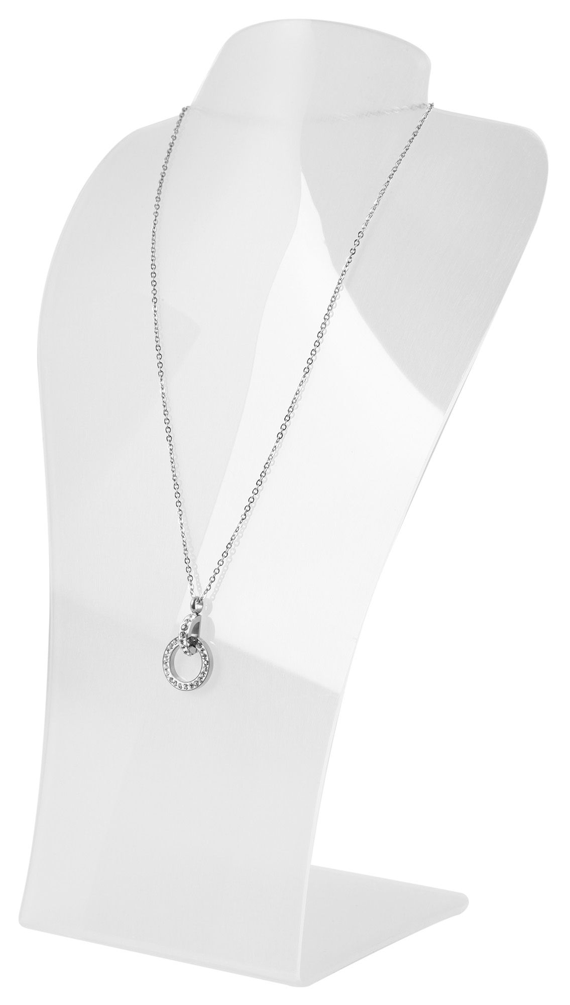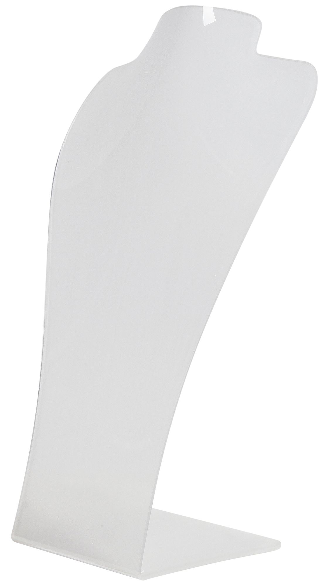 De grote plastic buste is een eenvoudige buste die geschikt is voor het tonen van kettingen en kettingen. Hij staat op een 9 cm lange, stevig verbonden voet en is over het geheel licht naar achteren gebogen. Dit betekent dat de sieraden in de perfecte hoek op de buste liggen zodat ze op de best mogelijke manier gepresenteerd kunnen worden. De overige afmetingen komen voort uit een breedte van 18 cm en een hoogte van 30 cm. De sieradenbuste is gemaakt van transparant acryl en heeft een glanzend oppervlak. Hierdoor komen de sieraden het best tot hun recht. Een eenvoudige presentatiemogelijkheid met een geweldig effect.