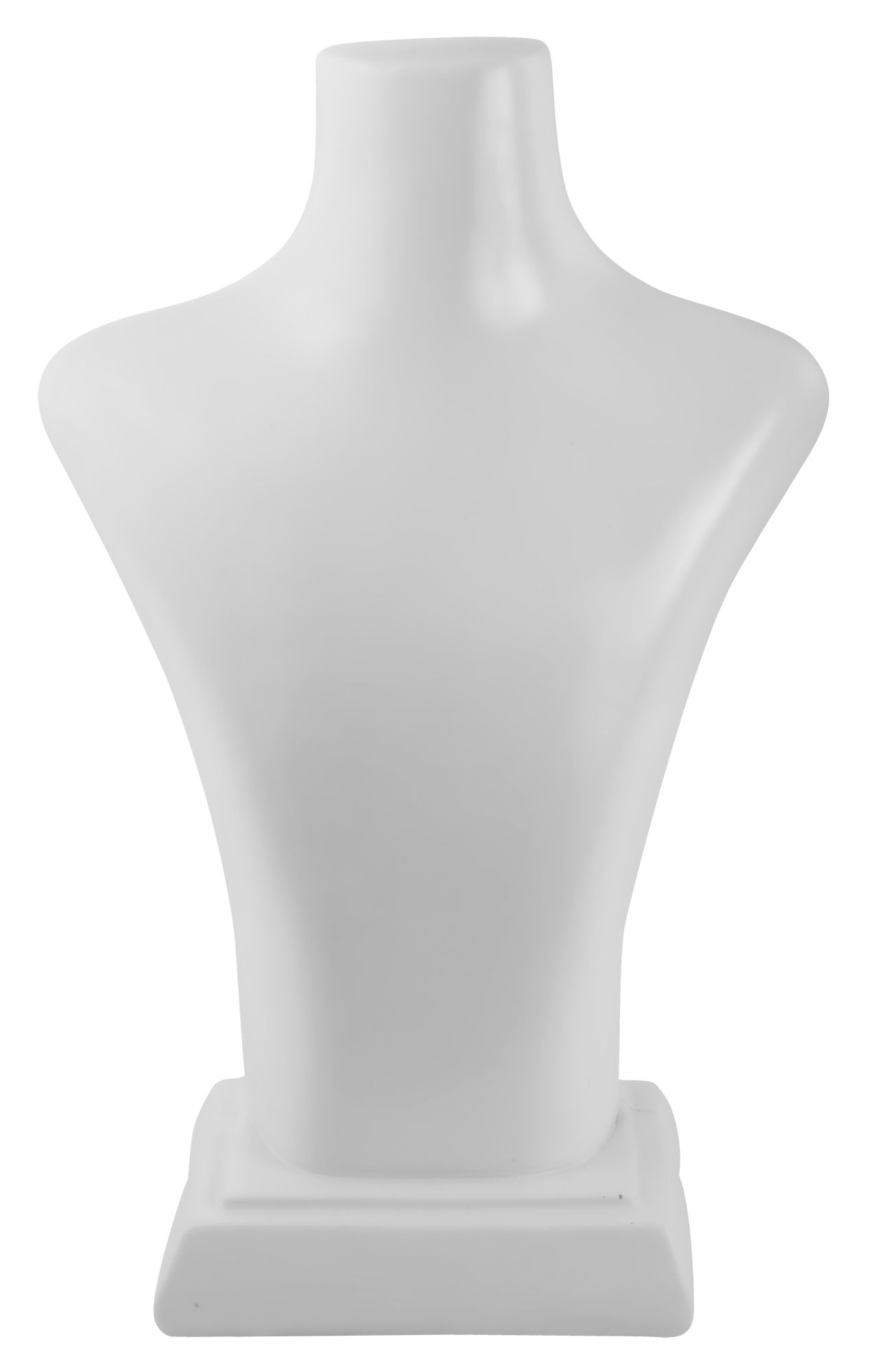 De plastic buste is een eenvoudige buste die geschikt is voor het presenteren van kettingen en kettingen. De sieraden liggen in de perfecte hoek op de buste zodat ze optimaal gepresenteerd kunnen worden. De buste meet 26,5 cm x 18 cm x 10 cm. Het oppervlak is mat en wit. Het is een gemakkelijke manier om kettingen en kettingen op de best mogelijke manier te presenteren.