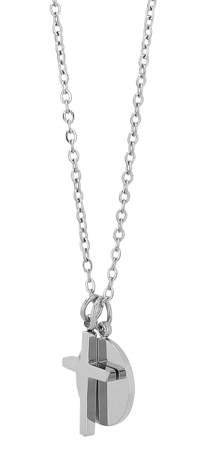 De ketting in het populaire ankerkettingontwerp is 41 cm lang, 1 mm dik en gemaakt van duurzaam roestvrij staal. De klassieke karabijnsluiting zorgt voor een veilige en eenvoudige sluiting en dankzij het verlengstuk van 5 cm past hij om elke halsmaat. Er zitten twee hangers aan de ketting, een kruis (H 13 mm, B 10 mm) en een ronde graveerhanger (Ø 10 mm) die de mogelijkheid biedt tot gravures op maat. De ketting is verkrijgbaar in twee kleurvariaties, kan perfect gecombineerd worden en biedt de mogelijkheid om je eigen persoonlijkheid en gevoel voor stijl tot uitdrukking te brengen.