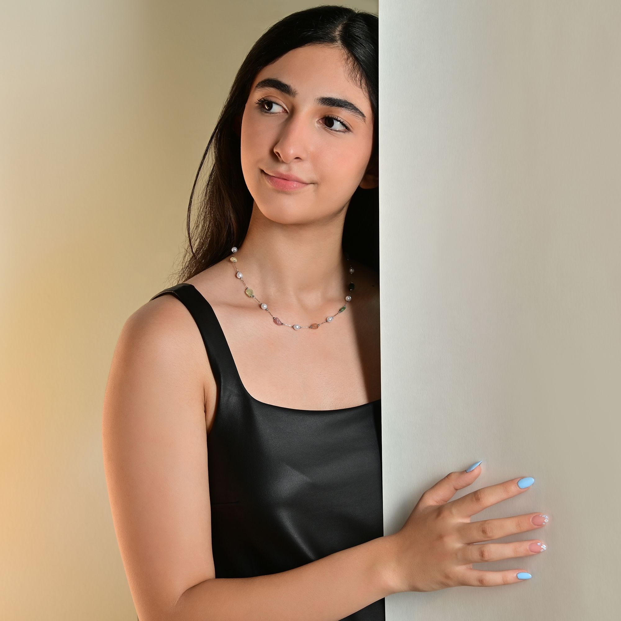 Mit einer Länge von 40 cm und einer Verlängerung von 5 cm bietet diese Kette eine perfekte Passform und viele Tragemöglichkeiten. Der Karabinerverschluss sorgt nicht nur für sicheren Halt, sondern auch für ein müheloses An- und Ablegen. Das Herzstück dieser Kette sind die neun farbigen Natursteine, jeder ein Kunstwerk der Natur mit individueller Schönheit. In verschiedenen Größen angeordnet, verleihen sie der Kette eine unvergleichliche Ästhetik und Tiefe. Ergänzt werden sie durch zehn Süßwasserperlen, jede einzigartig und von zeitloser Schönheit. Gemeinsam schaffen sie eine harmonische Verbindung von Natürlichkeit und Eleganz.
