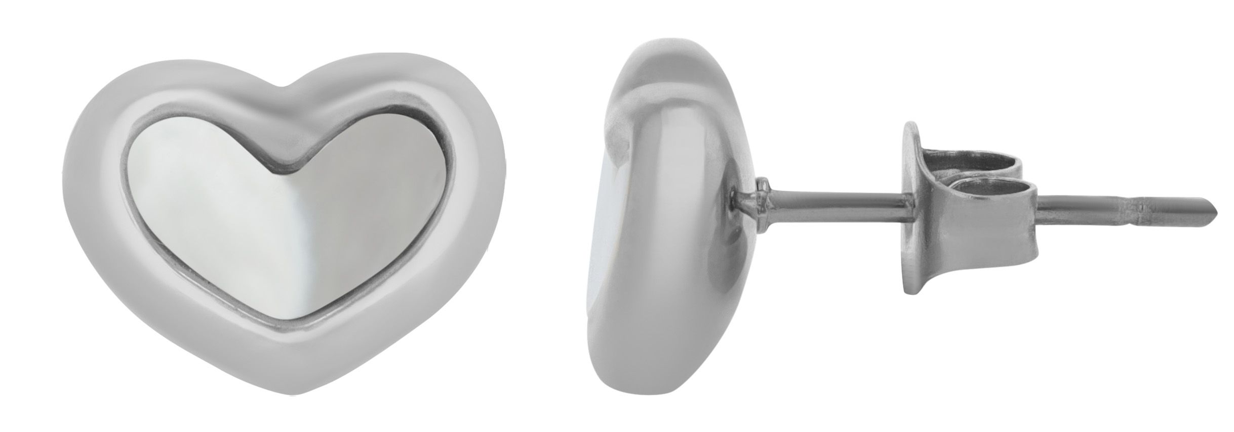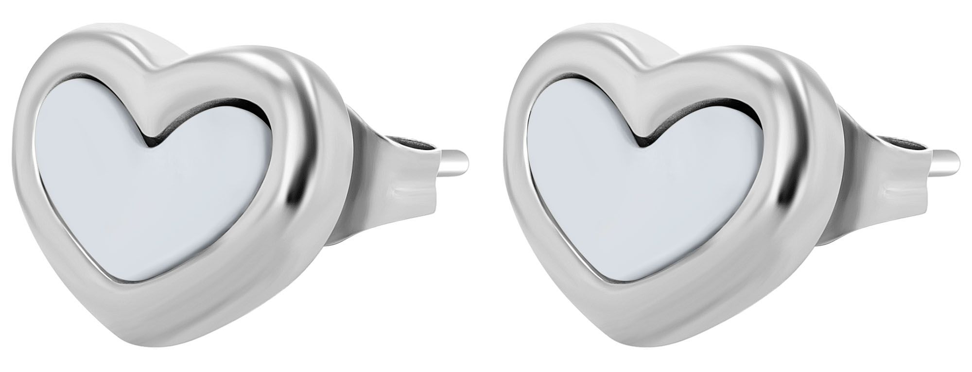 "Candela" - Hart, roestvrijstalen oorbellen met echte parelmoer elementen, zilverkleurig Elke oorbel is versierd met een echt parelmoer element, dat een aura van gratie en mystiek verleent met zijn glinsterende kleuren en zachte reflecties.
