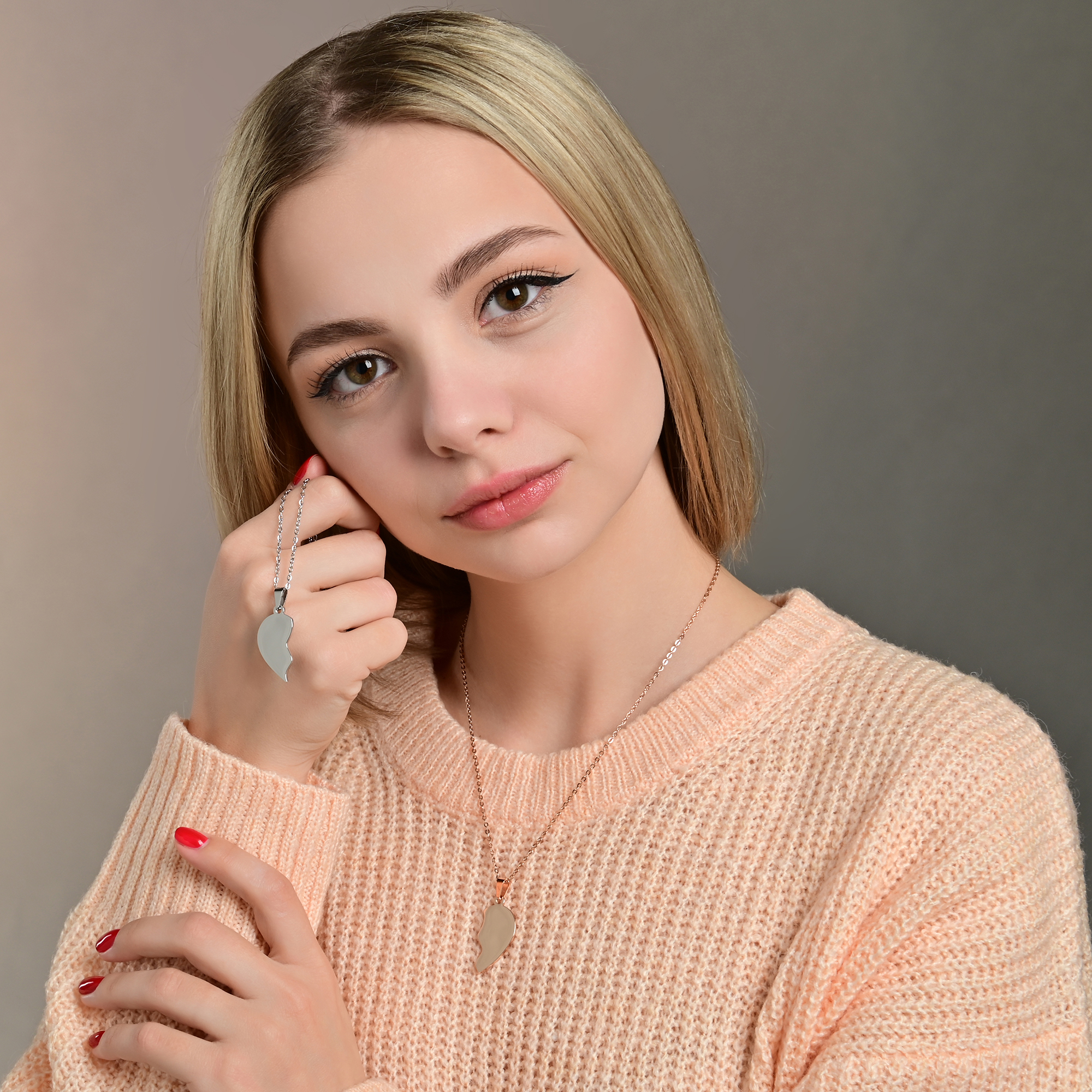 De kettingen van het merk Akzent zijn gemaakt van roestvrij staal in een ankerpatroon. Aan elke ketting zit een hanger in de vorm van een half hart. Deze kettingen zijn het perfecte accessoire om vriendschap of liefde te vieren met je dierbaren en zijn helemaal individueel, omdat de hartenhanger gegraveerd kan worden om het sieraad uniek te maken. Beide kettingen kunnen worden geopend en gesloten met een karabijnsluiting, die ook van roestvrij staal is gemaakt. Bovendien is aan beide uiteinden van de kettingen een verlengstuk van 5 cm bevestigd, waardoor de lengte kan worden gevarieerd en het delicate sieraad aan elke outfit kan worden aangepast.