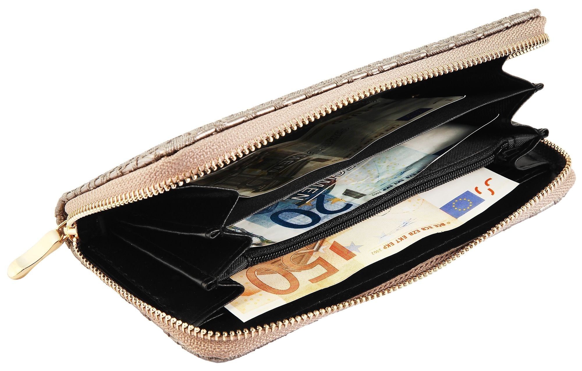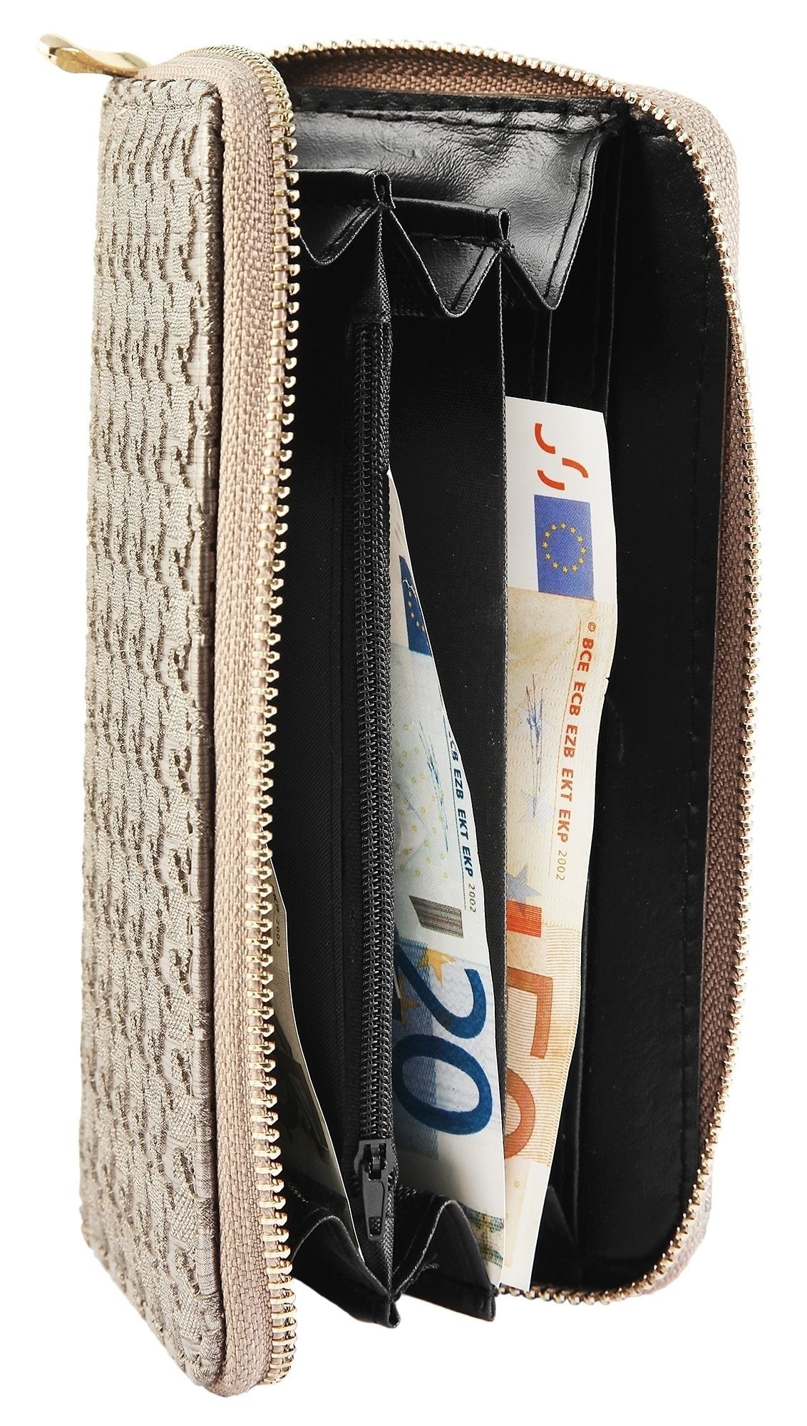 Damesportemonnee van imitatieleer. De liggende portemonnee is 19 cm breed en 10 cm hoog. De kleur is . De echt leren portemonnee wordt gesloten met een rits. Hij heeft 5 compartimenten voor biljetten, een klein vakje voor kleingeld en 8 vakjes voor creditcards,