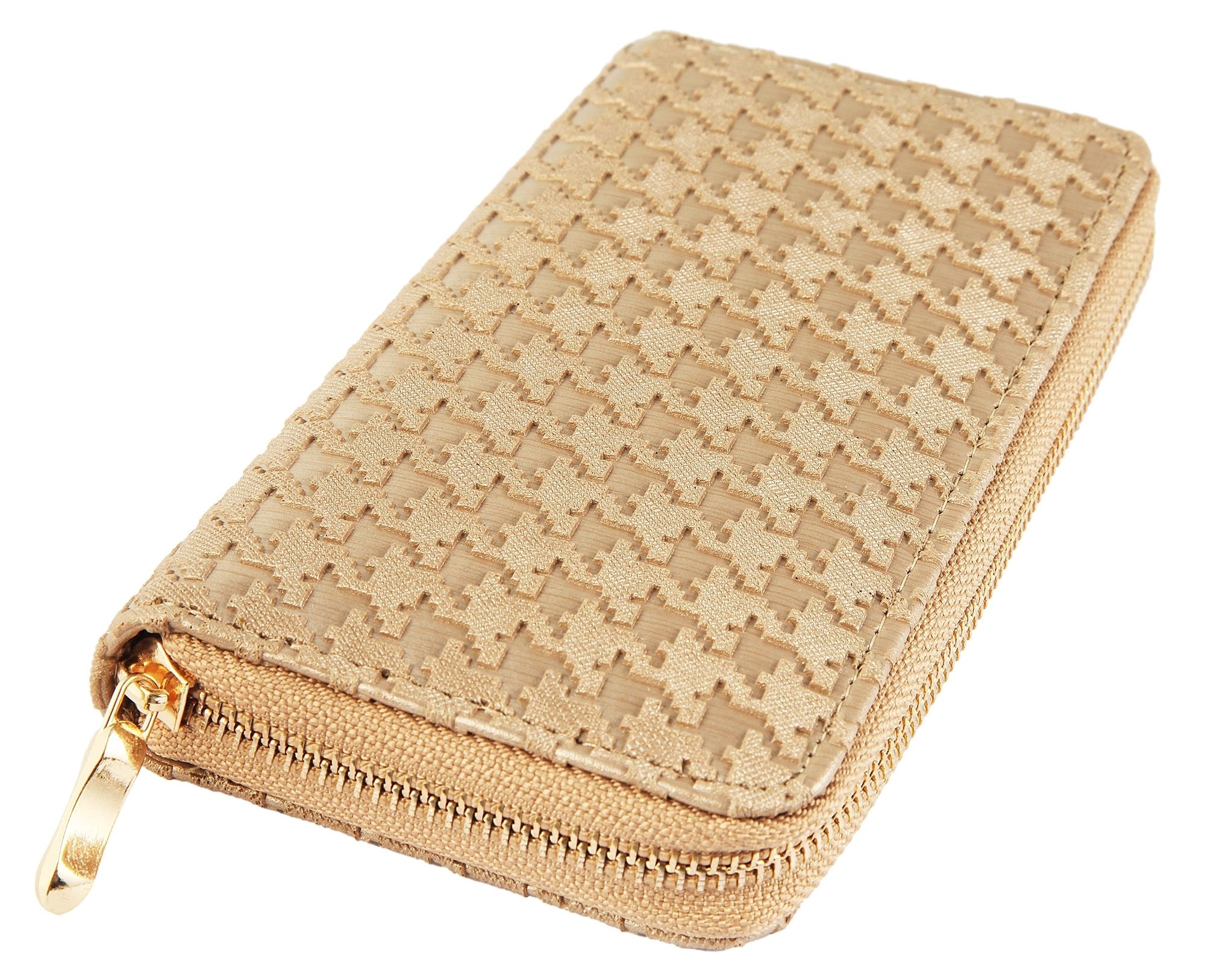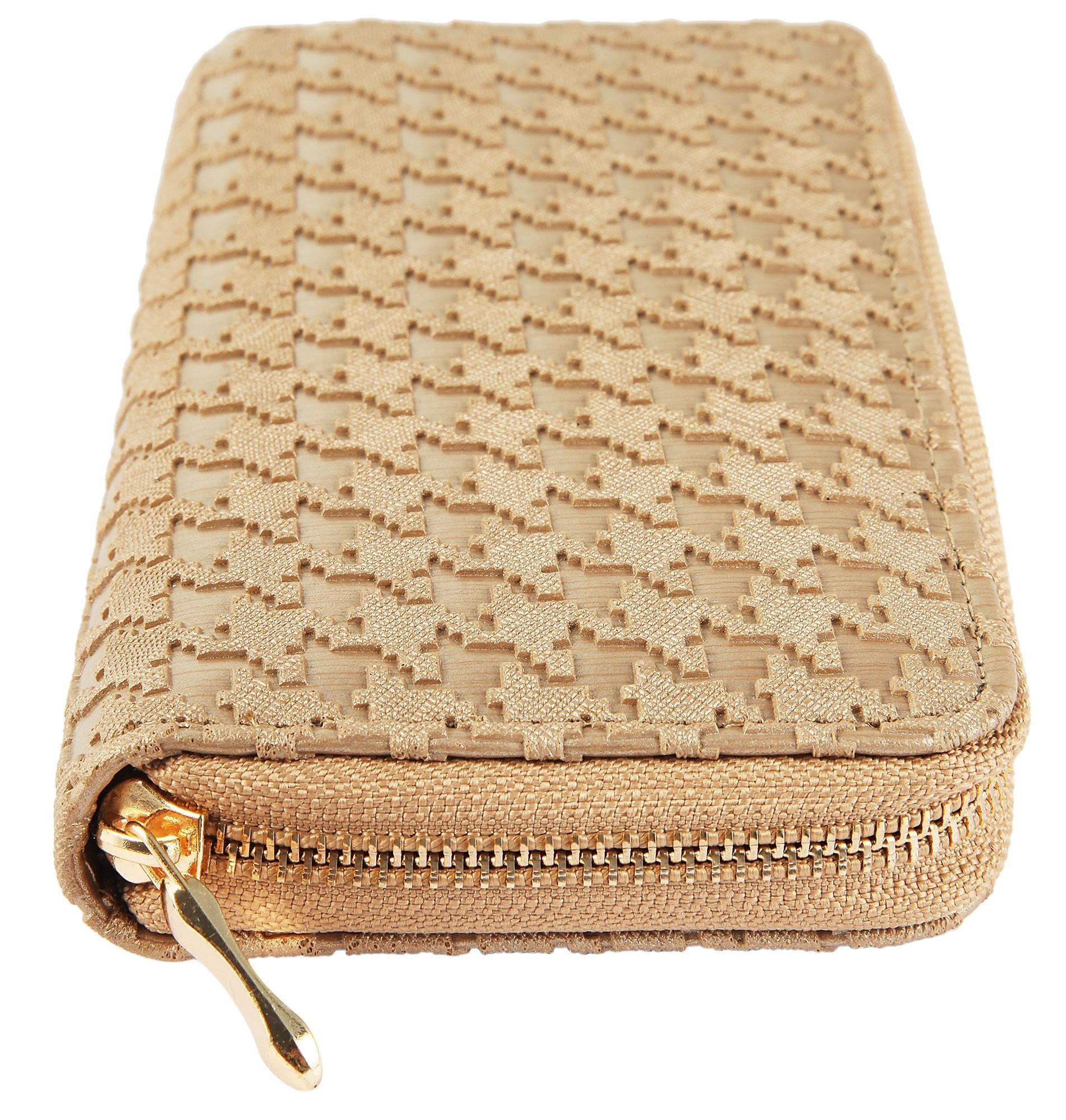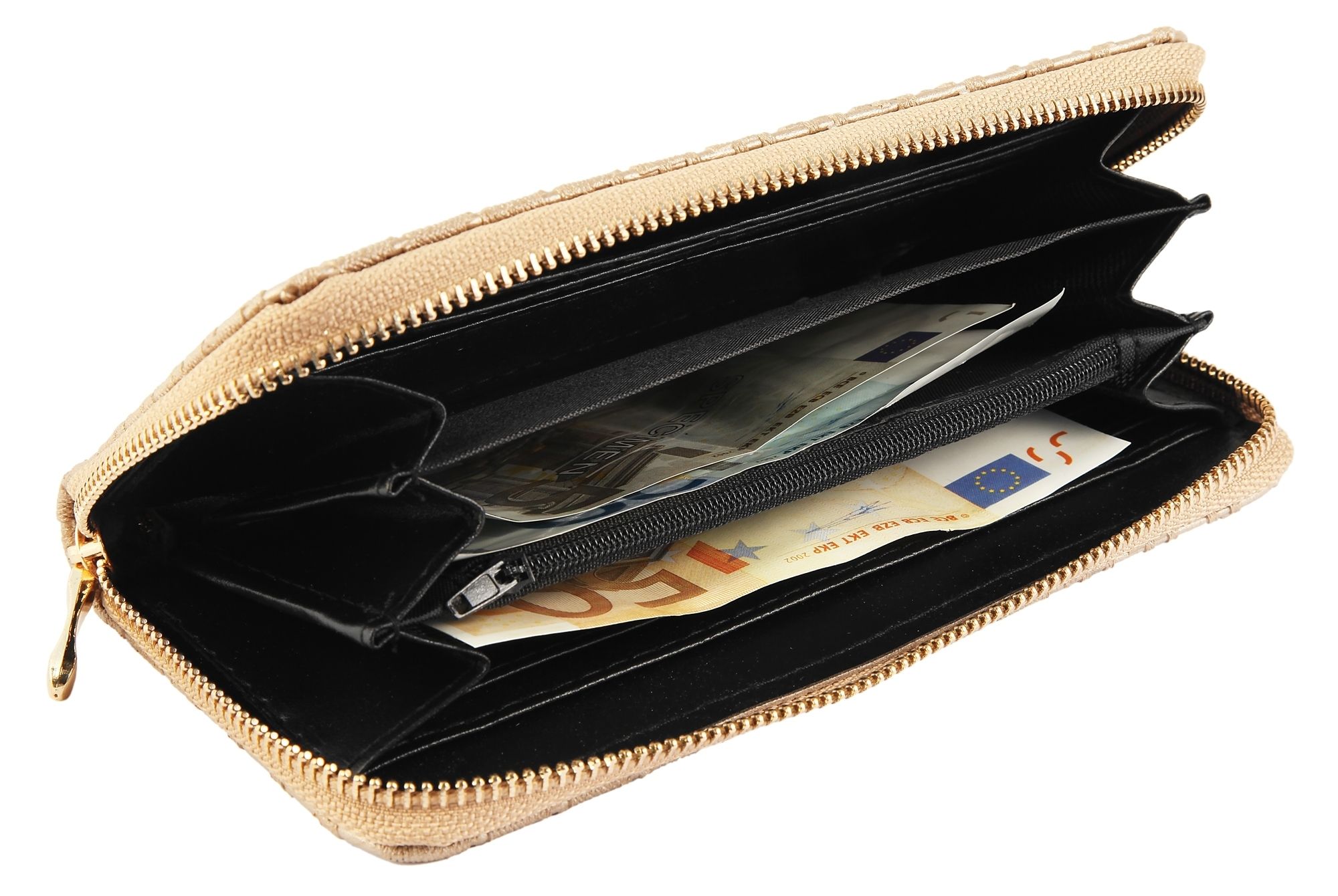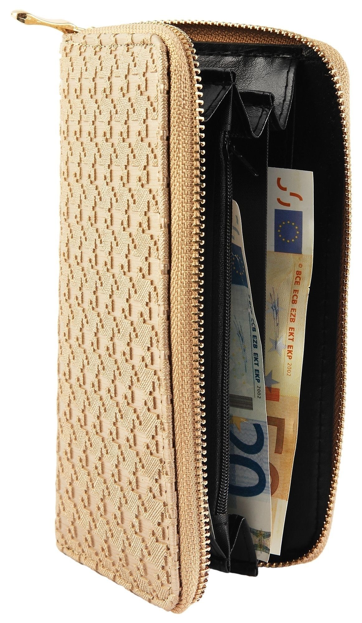 Damesportemonnee van imitatieleer. De liggende portemonnee is 19 cm breed en 10 cm hoog. De kleur is lichtbruin. De echt leren portemonnee wordt gesloten met een rits. Hij heeft 5 biljetvakken, een klein kleingeldvakje en 8 creditcardvakjes,