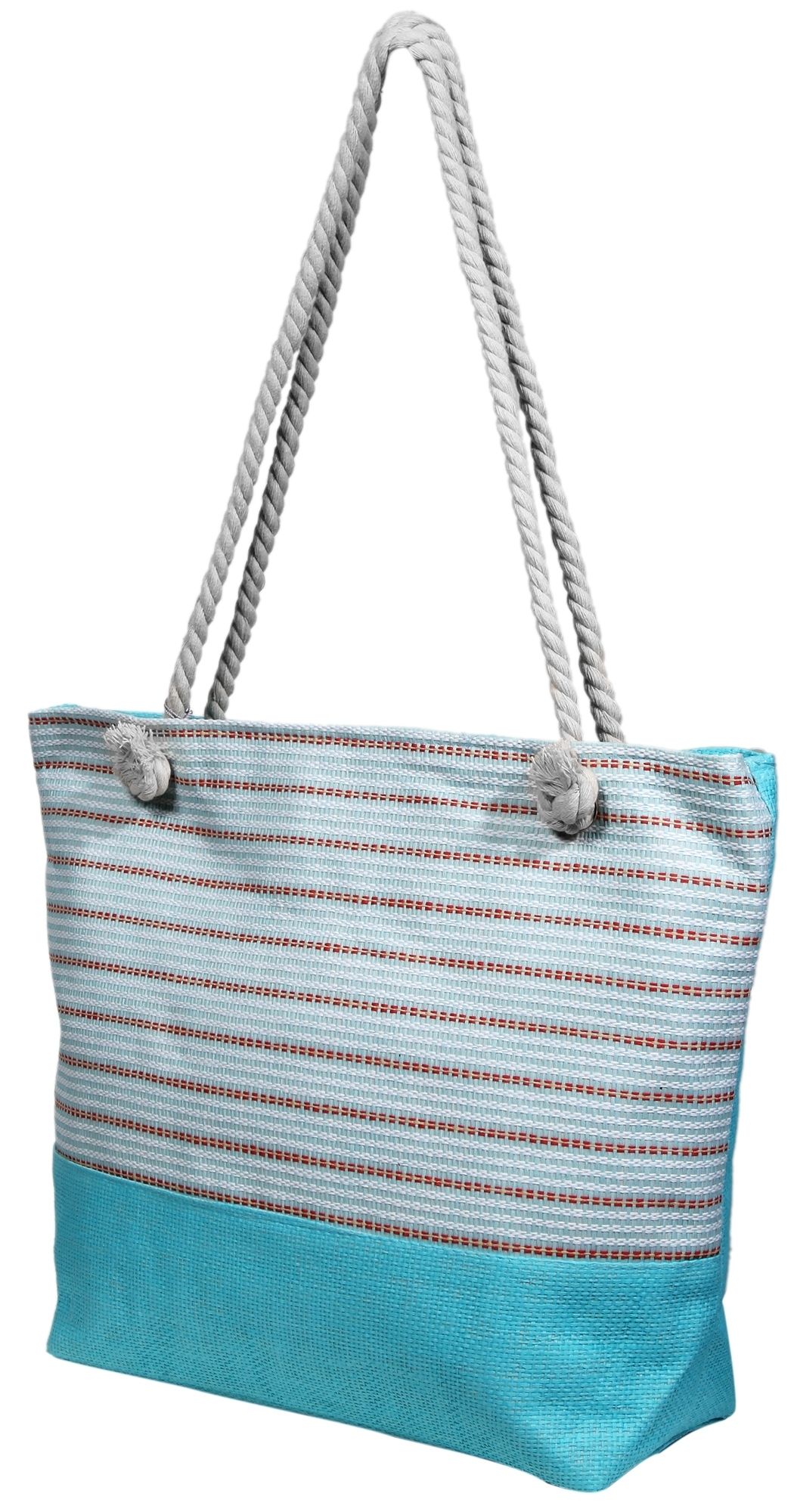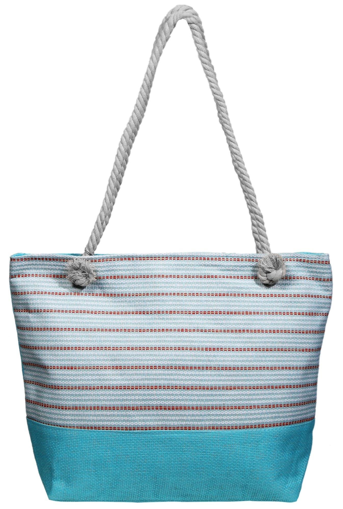 De kleurrijke handtas met trekkoordhengsels is gemaakt van textiel en is versierd met blauw/turquoise strepen. De zomerse tas biedt veel opbergruimte, heeft een groot binnenvak met ritssluiting en binnenin een vakje voor je mobiele telefoon. Dankzij het materiaal en het ontwerp kan deze handtas ook heel goed als strandtas worden gedragen. De tas is 14 cm lang, 51 cm breed en 37 cm hoog.