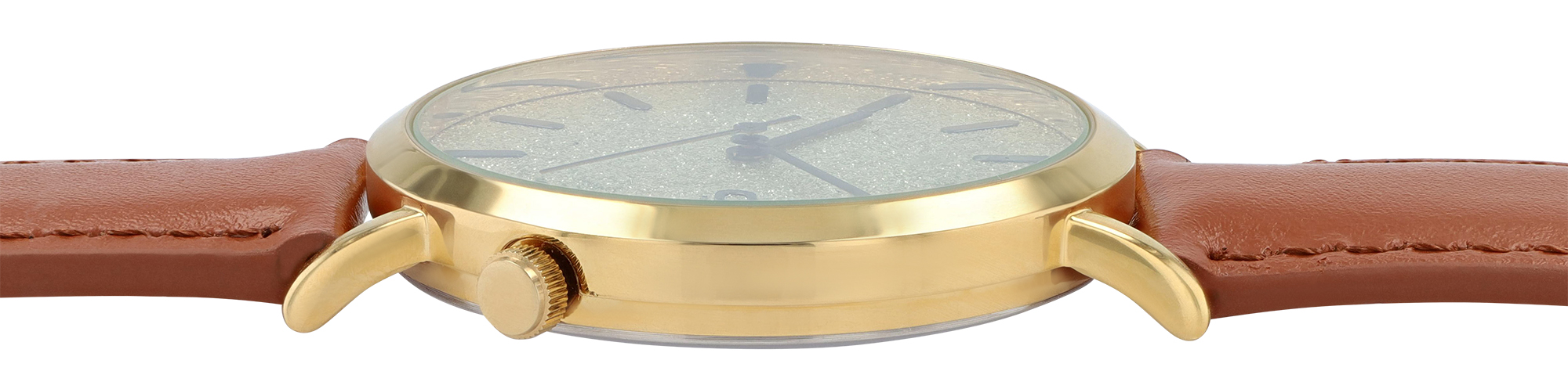 De robuuste metalen kast heeft een aantrekkelijke diameter van 40 mm. Een bijzonder hoogtepunt is de wijzerplaat, die een all-over gouden glitterafwerking heeft. Deze sprankelende textuur vangt het licht op een unieke manier en creëert een luxueuze glamour. De tijd wordt weergegeven met een eenvoudige streepindex.