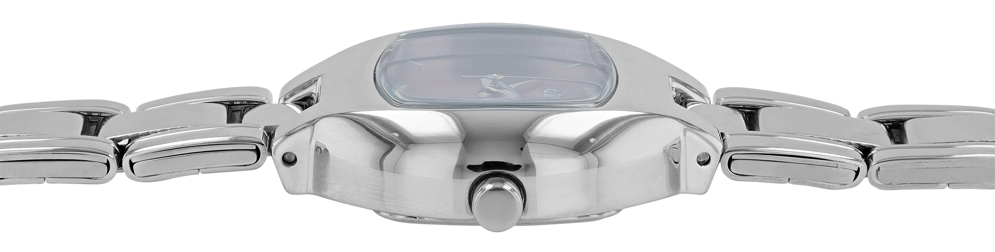 De kast van het horloge is rechthoekig en zacht afgerond, waardoor een moderne maar zachte vorm ontstaat. De wijzerplaat is helder en schoon met een glanzende look en benadrukt de elegantie van het horloge. De tijdsaanduiding heeft een eenvoudige lijnindex, met de 6 en 12 gemarkeerd als Arabische cijfers.