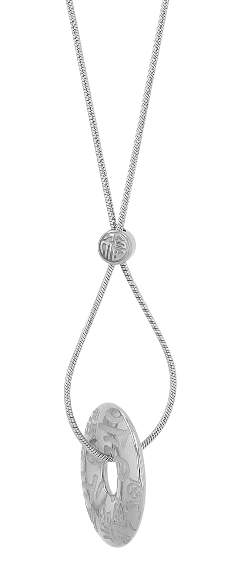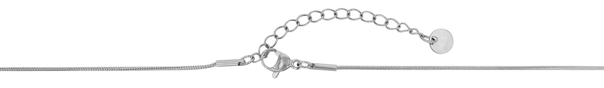 De slangenketting is gemaakt van roestvrij staal, omdat dit materiaal een lange levensduur van de ketting garandeert. De ketting wordt achter in de nek bevestigd met een roestvrijstalen karabijnsluiting. De ketting is 38 cm lang en 1 mm dik. Hij kan indien nodig met 5 cm worden verlengd zodat hij op maat kan worden gemaakt. De ketting heeft ook een ronde hanger met belettering die gewoon aan de andere kant gedragen kan worden. De diameter van de hanger is 20 mm. Het visuele hoogtepunt is de ringhanger, die de ketting geleidt en waarmee de look kan worden veranderd met een schuifballetje. De 2 kleurvarianten maken het gemakkelijk om een ongewoon accessoire te kiezen.