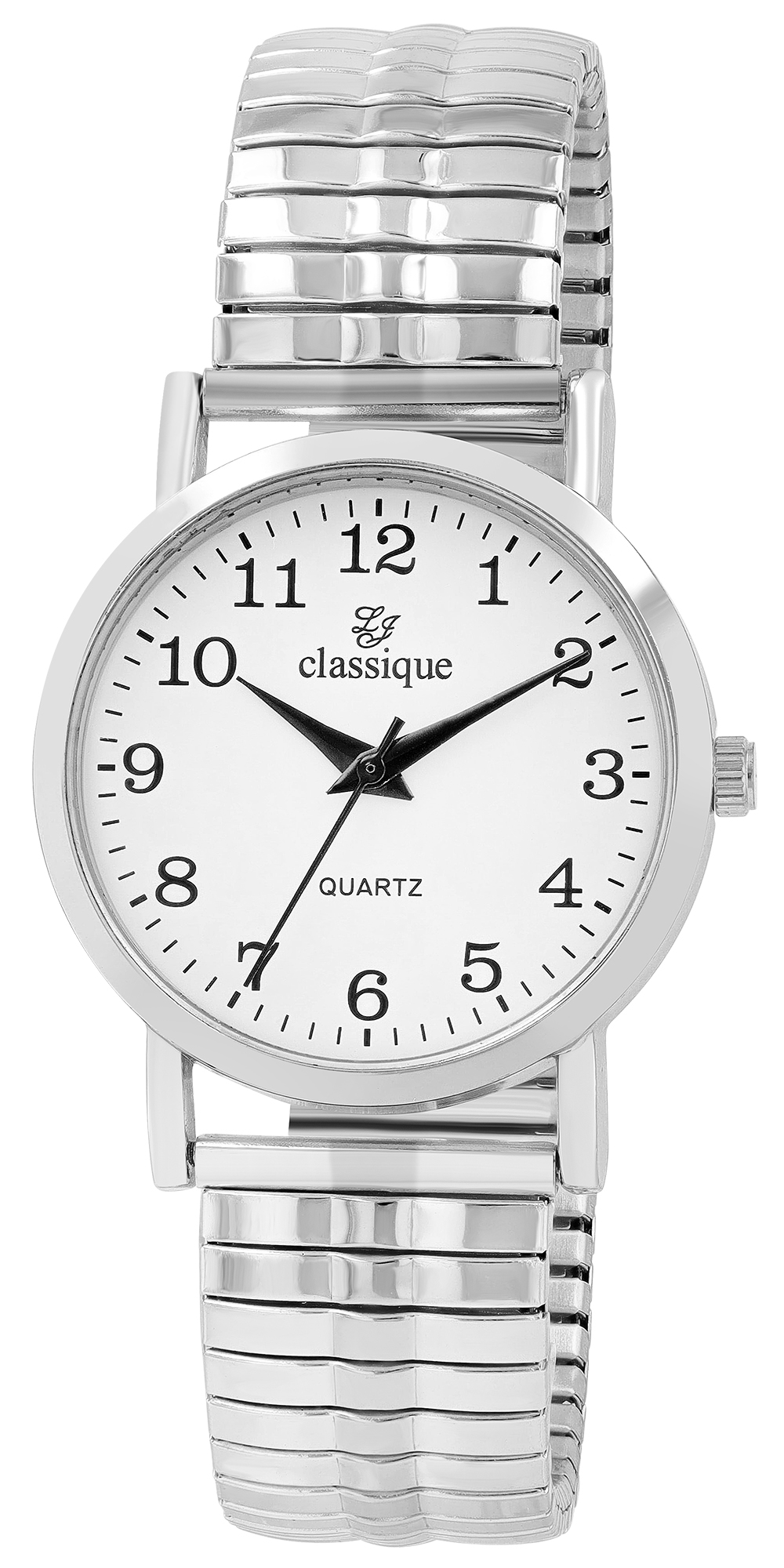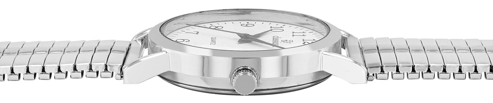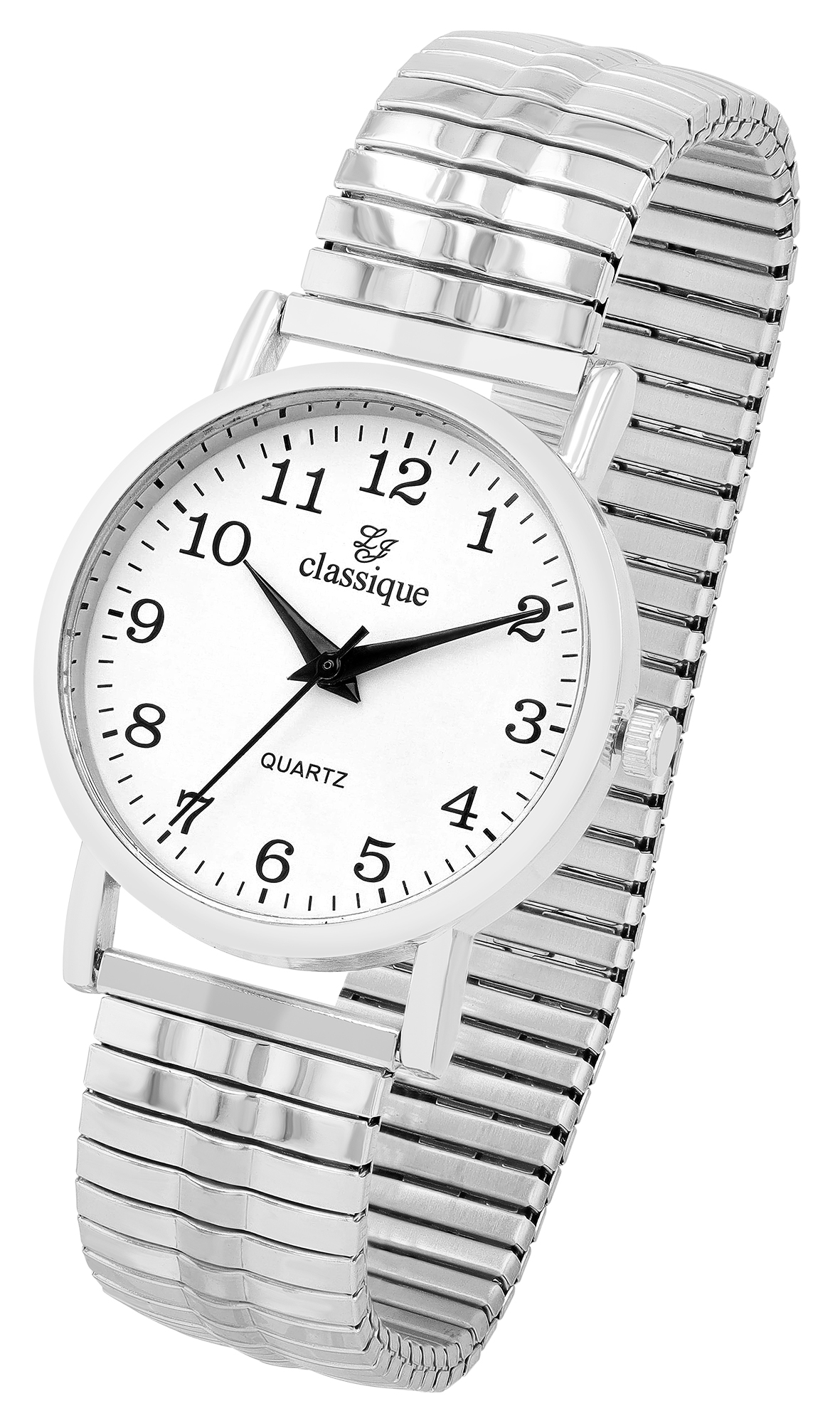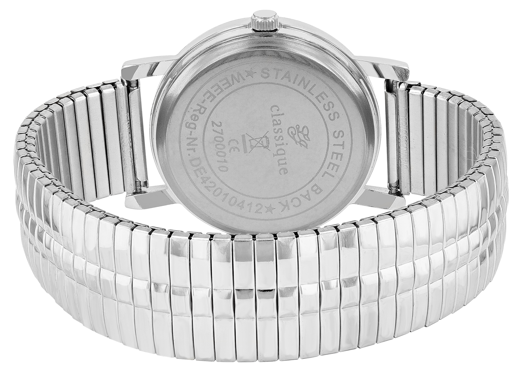 Het analoge herenpolshorloge met 3 wijzers van het merk Classique heeft een hoogwaardig kwartsuurwerk. De roestvrijstalen trekband is 18 mm breed bij de lug en is bijzonder comfortabel en gemakkelijk over de pols te trekken dankzij de flexibele band. De totale lengte van het horloge is 19 cm. De metalen kast met mineraalglas heeft een diameter van 34 mm en een kasthoogte van 8 mm. De achterkant van de kast is gemaakt van roestvrij staal. De tijd kan snel in één oogopslag worden afgelezen dankzij de eenvoudige wijzerplaat en duidelijke lay-out.