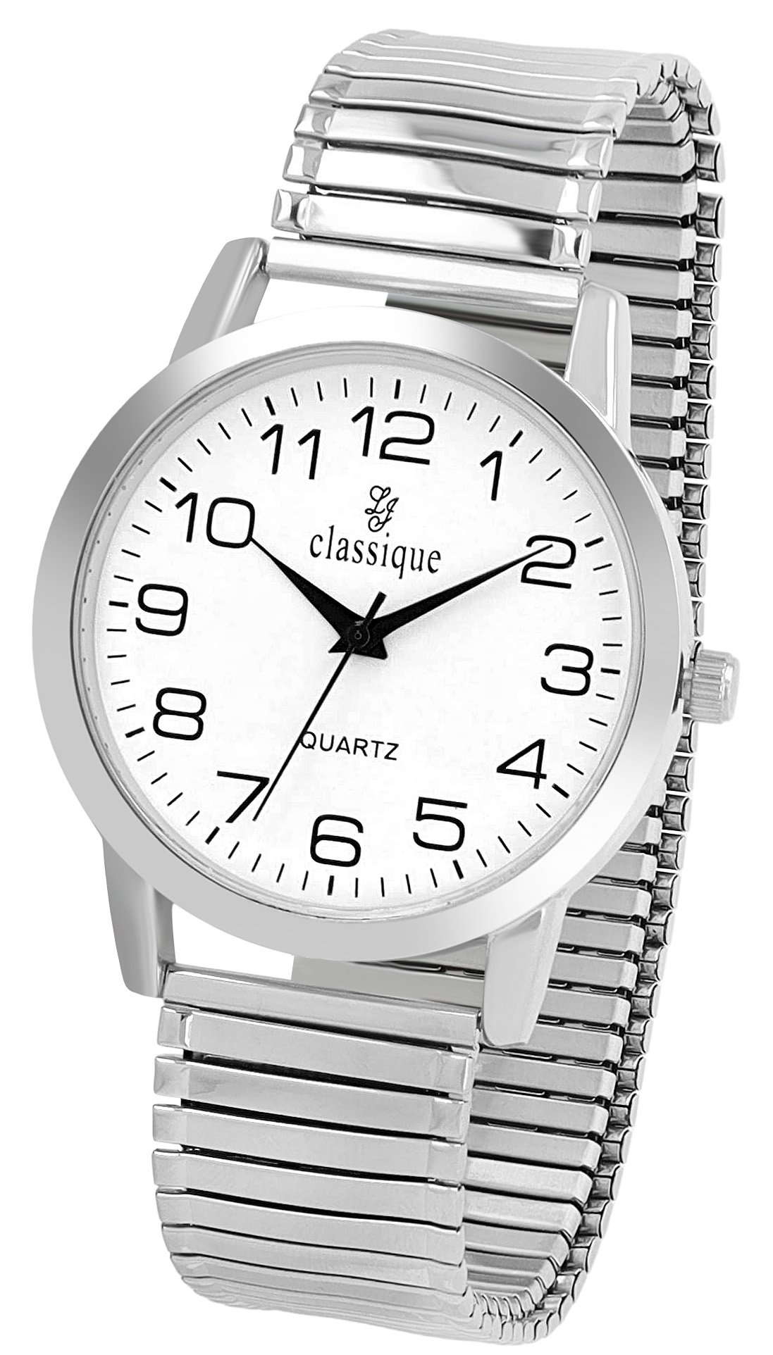 Het analoge herenpolshorloge met 3 wijzers van het merk Classique heeft een hoogwaardig kwartsuurwerk. De flexibele trekband is gemaakt van roestvrij staal, kan comfortabel en gemakkelijk over de pols worden getrokken en is 20 mm breed bij de lug. De totale lengte van het horloge is 20 cm. De metalen kast met mineraalglas heeft een diameter van 40 mm en een kasthoogte van 9 mm. De achterkant van de kast is gemaakt van roestvrij staal. De heldere wijzerplaat met zwarte wijzers en Arabische cijfers zorgt voor een duidelijke weergave zodat je snel de tijd kunt zien.
