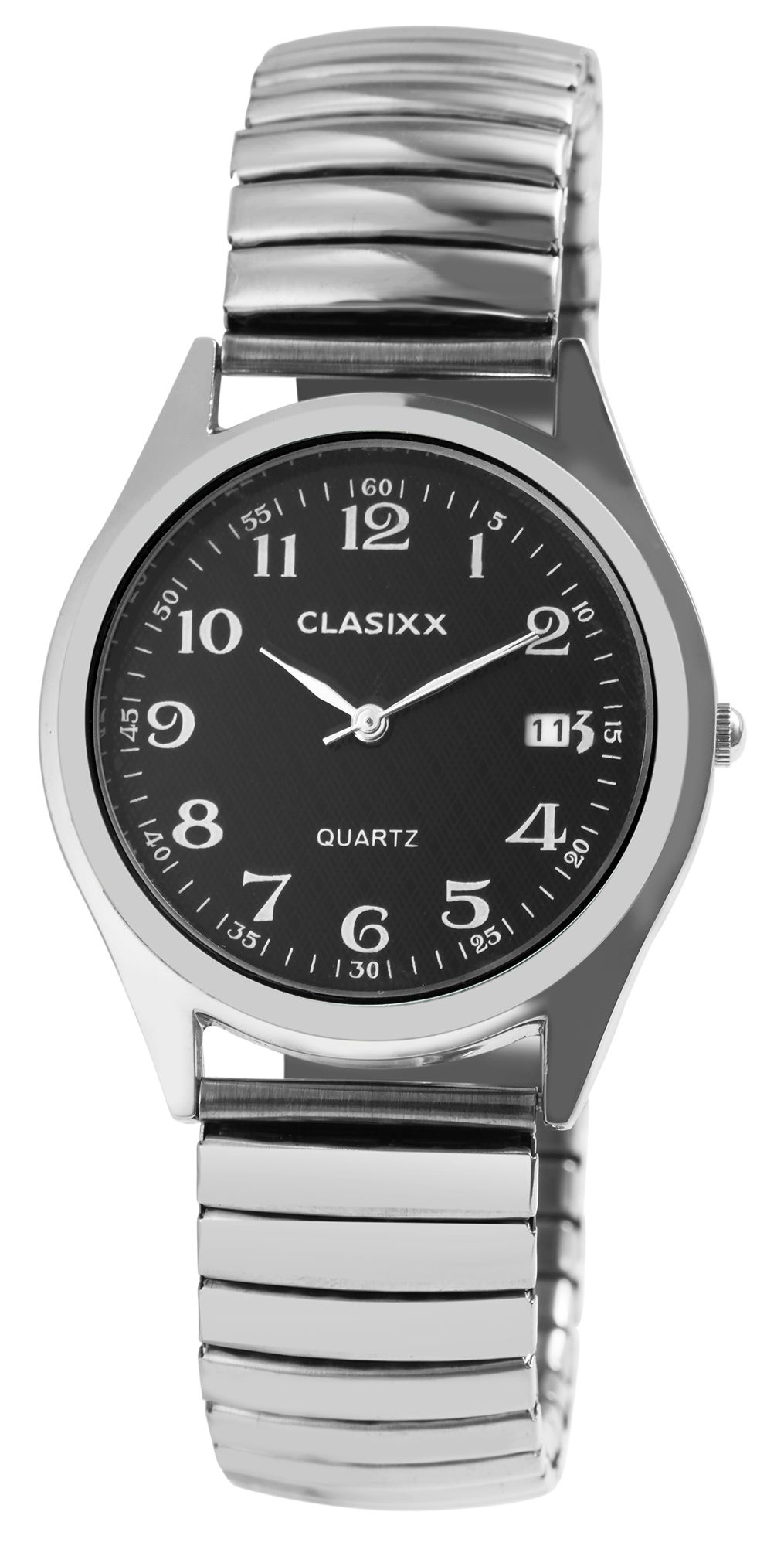 Het analoge herenpolshorloge met 3 wijzers van het merk Classix heeft een hoogwaardig kwartsuurwerk. De roestvrijstalen trekband is 18 mm breed bij de lug en kan gemakkelijk over de pols worden getrokken dankzij de elastische band. De totale lengte van het horloge is 21 cm. De metalen kast met mineraalglas heeft een diameter van 36 mm en een kasthoogte van 9 mm. De achterkant van de kast is gemaakt van roestvrij staal. De wijzers en Arabische cijfers hebben dezelfde kleur, passen goed bij de algehele look van het horloge en contrasteren met de kleur van de wijzerplaat, waardoor het gemakkelijk is om de tijd af te lezen. Het herenhorloge heeft ook een datumweergave.