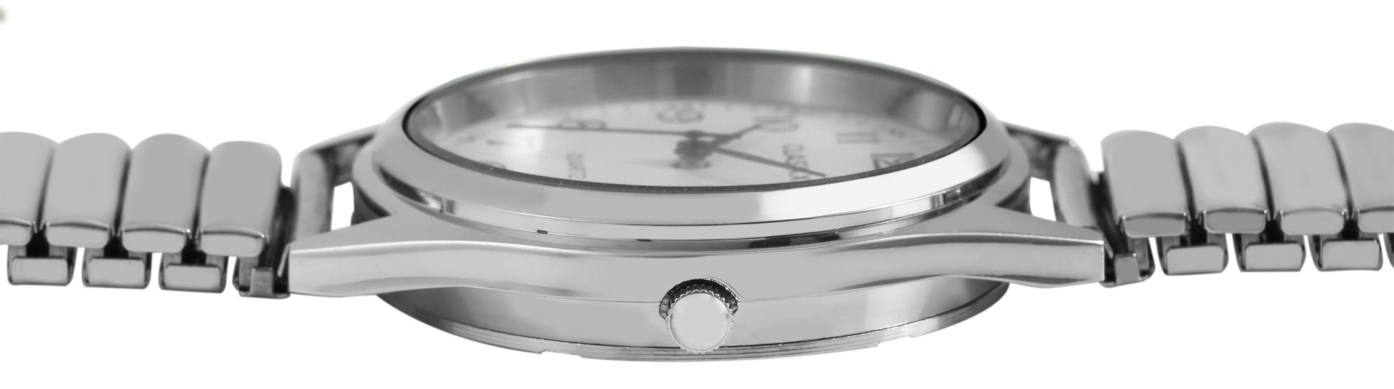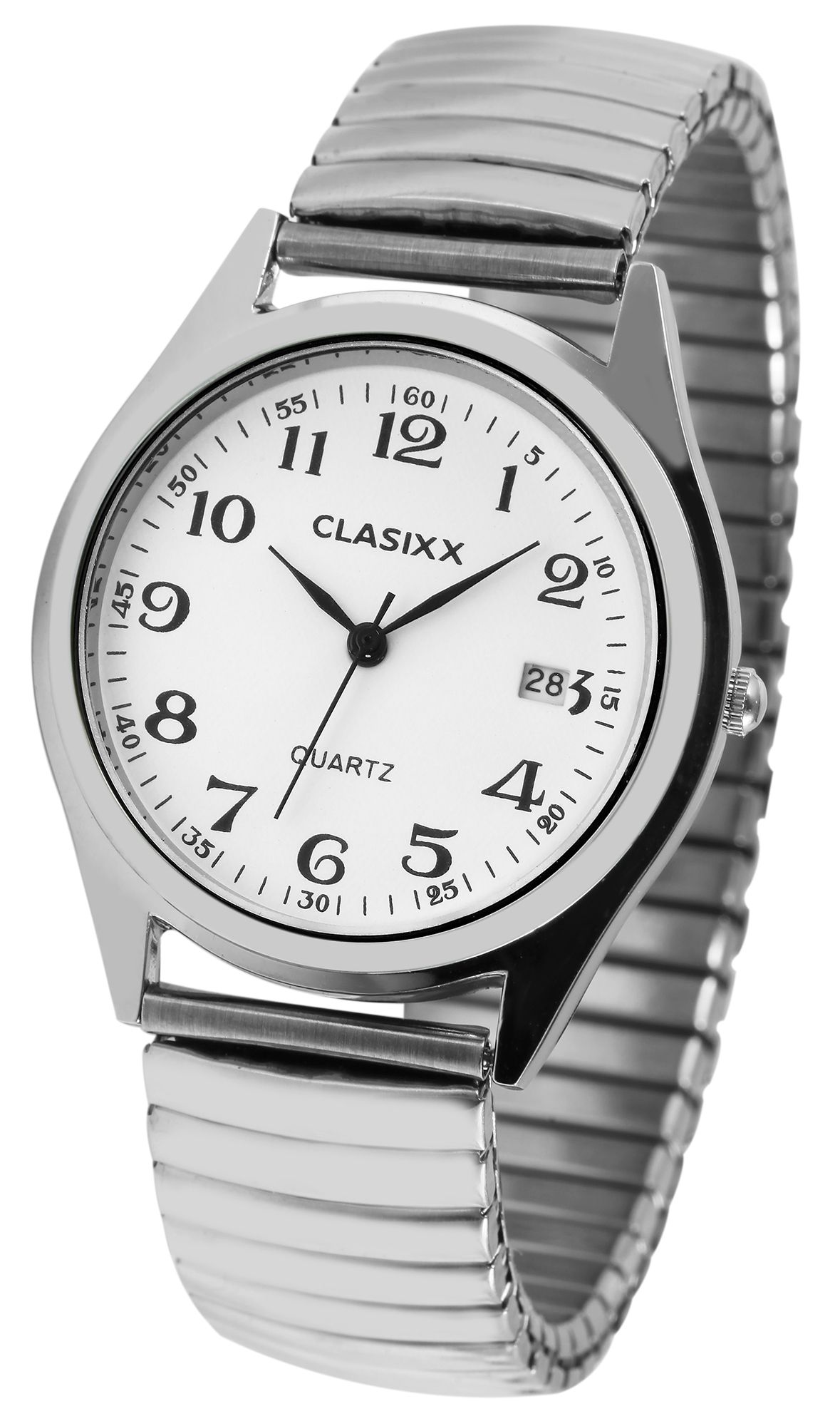 Het analoge herenpolshorloge met 3 wijzers van het merk Classix heeft een hoogwaardig kwartsuurwerk. De roestvrijstalen trekband is 18 mm breed bij de lug en kan gemakkelijk over de pols worden getrokken dankzij de elastische band. De totale lengte van het horloge is 21 cm. De metalen kast met mineraalglas heeft een diameter van 36 mm en een kasthoogte van 9 mm. De achterkant van de kast is gemaakt van roestvrij staal. De wijzers en Arabische cijfers hebben dezelfde kleur, passen goed bij de algehele look van het horloge en contrasteren met de kleur van de wijzerplaat, waardoor het gemakkelijk is om de tijd af te lezen. Het herenhorloge heeft ook een datumweergave.