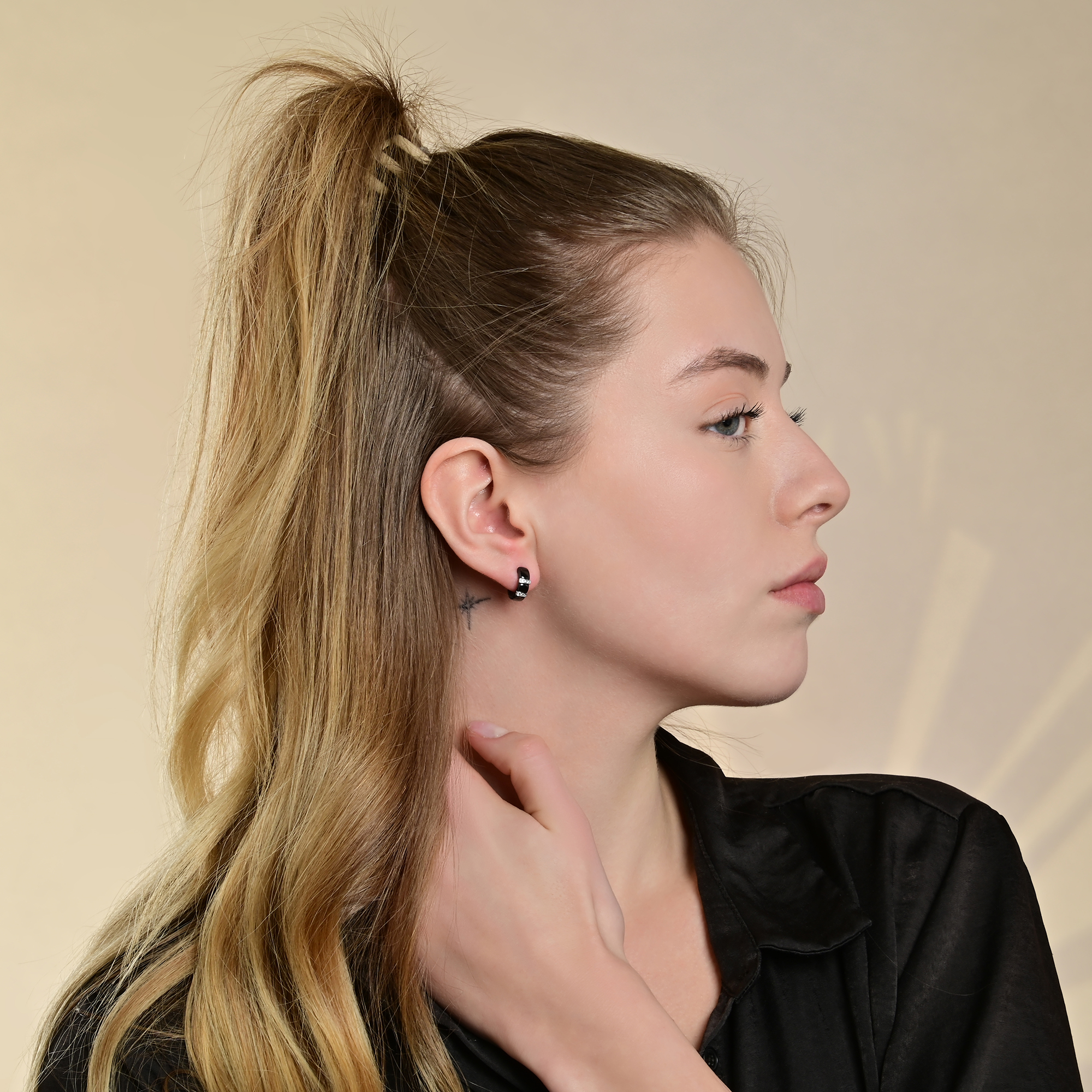 Met een hoogte van 12 mm, een breedte van 5 mm en een dikte van 3 mm is dit oorsieraad een discrete maar expressieve metgezel voor elke gelegenheid. De push-in sluiting zorgt voor een stevige bevestiging, terwijl de zirkoniazetting voor een sprankelende highlight zorgt. Verkrijgbaar in zwart of wit, zijn deze oorbellen de perfecte aanvulling op elke outfit - klassiek of elegant.